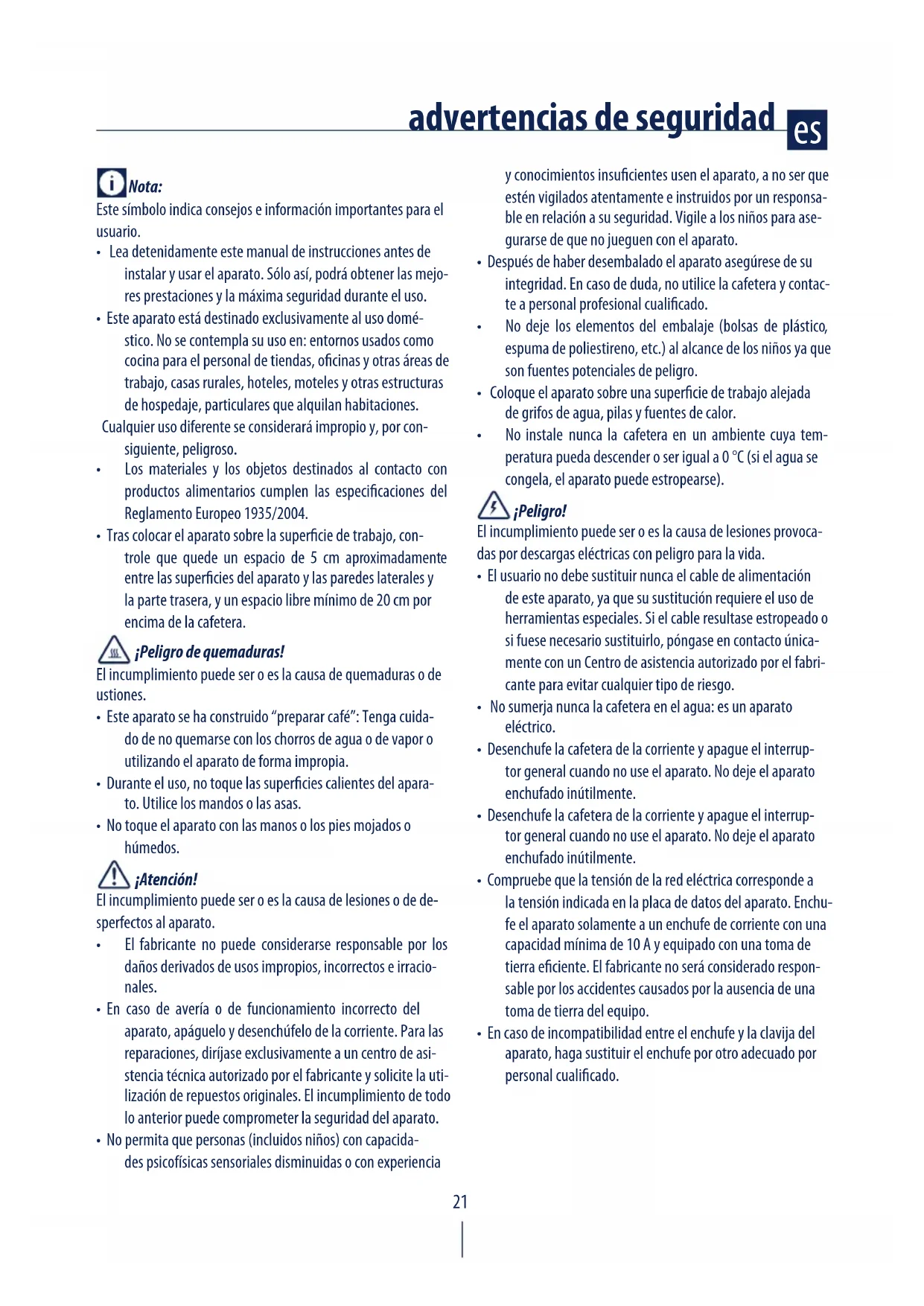 - Este aparato se ha construido “preparar café”: Tenga cuida- do de no quemarse con los chorros de agua o de vapor o utilizando el aparato de forma impropia.