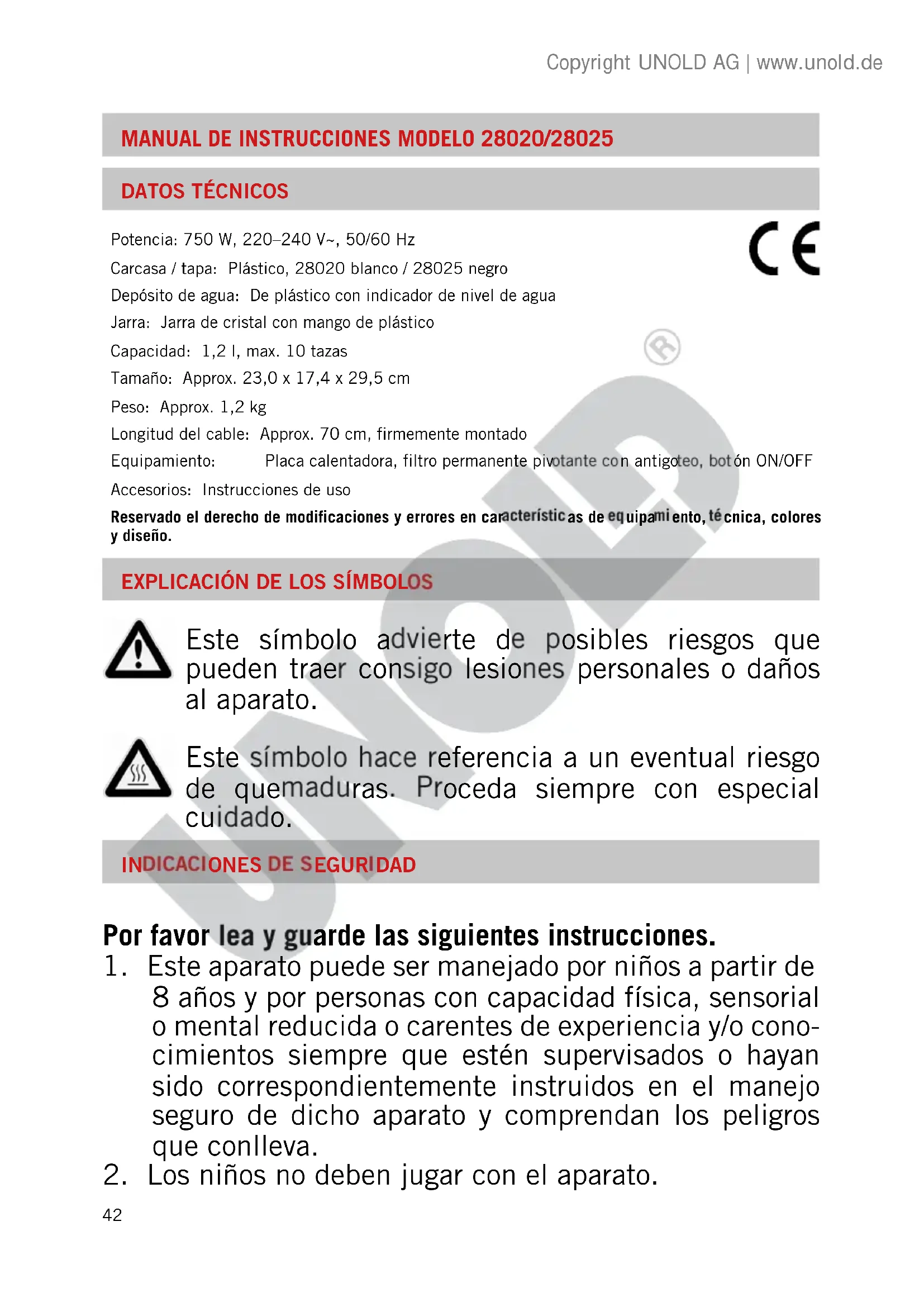 Este símbolo advierte de posibles riesgos que pueden traer consigo lesiones personales o daños al aparato. Este símbolo hace referencia a un eventual riesgo de quemaduras. Proceda siempre con especial cuidado. Copyright UNOLD AG | www.unold.de43