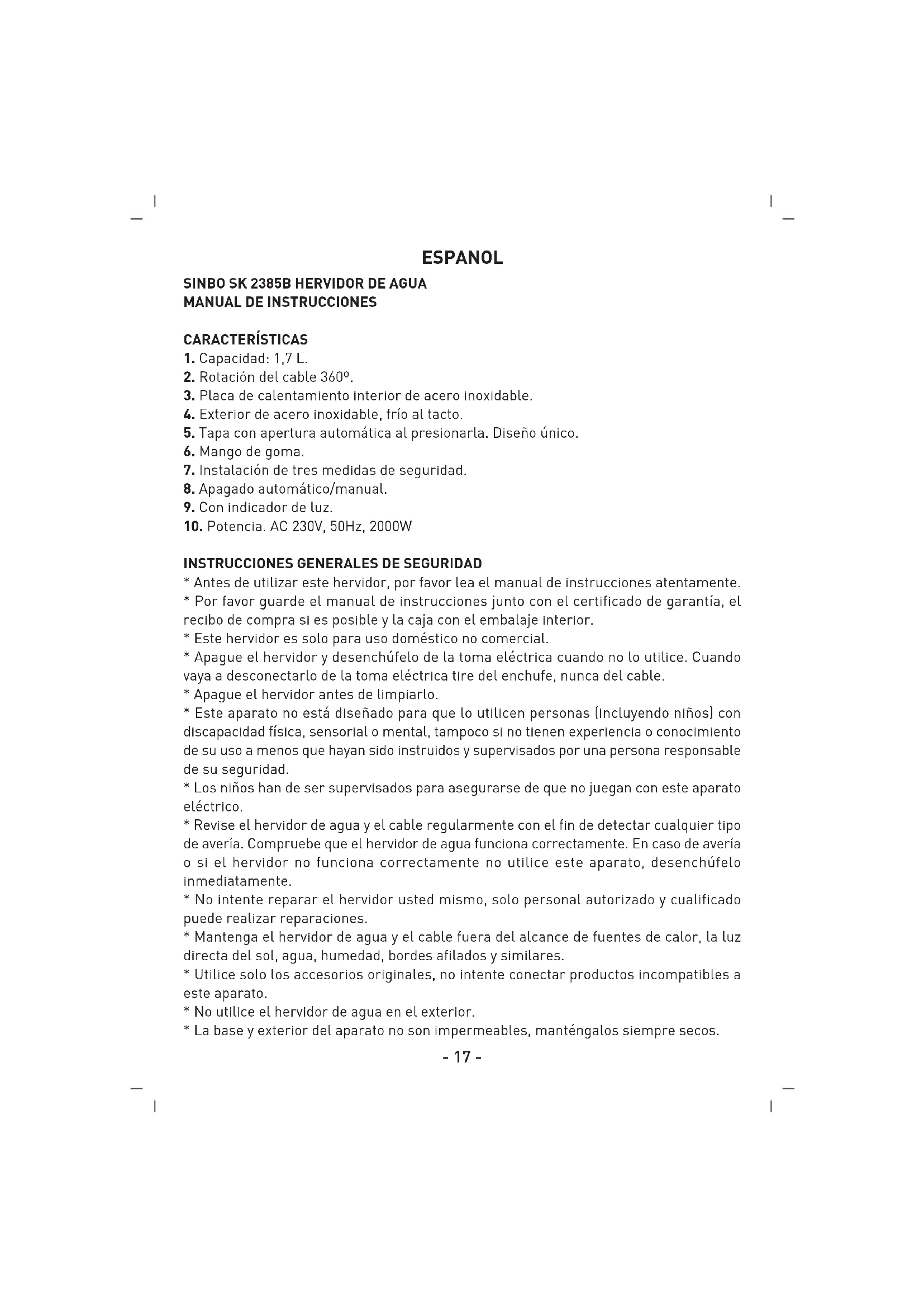 Este signo significa que este producto no se debe tirar junto con los residuos domésticos en la zona de UE. Con el objeto de evitar posibles daños a la salud pública y al medioambiente por deshechos de residuos incontrolados, recicle de forma responsable para promover la reutilización de recursos sostenibles. Cuando vaya a tirar este producto, llévelo a la tienda donde lo compró. Ellos podrán recoger este producto para reciclarlo teniendo en cuenta la seguridad medioambiental.- 20 -- 21 -- 22 -- 23 - No: 1-2385B-04102013- 24 -- 28 - 1-2385B-04102013- 29 -- 30 -- 31 -- 32 - HRVATSKI SINBO SK 2385B KETTLE/KUHALO ZA VODU