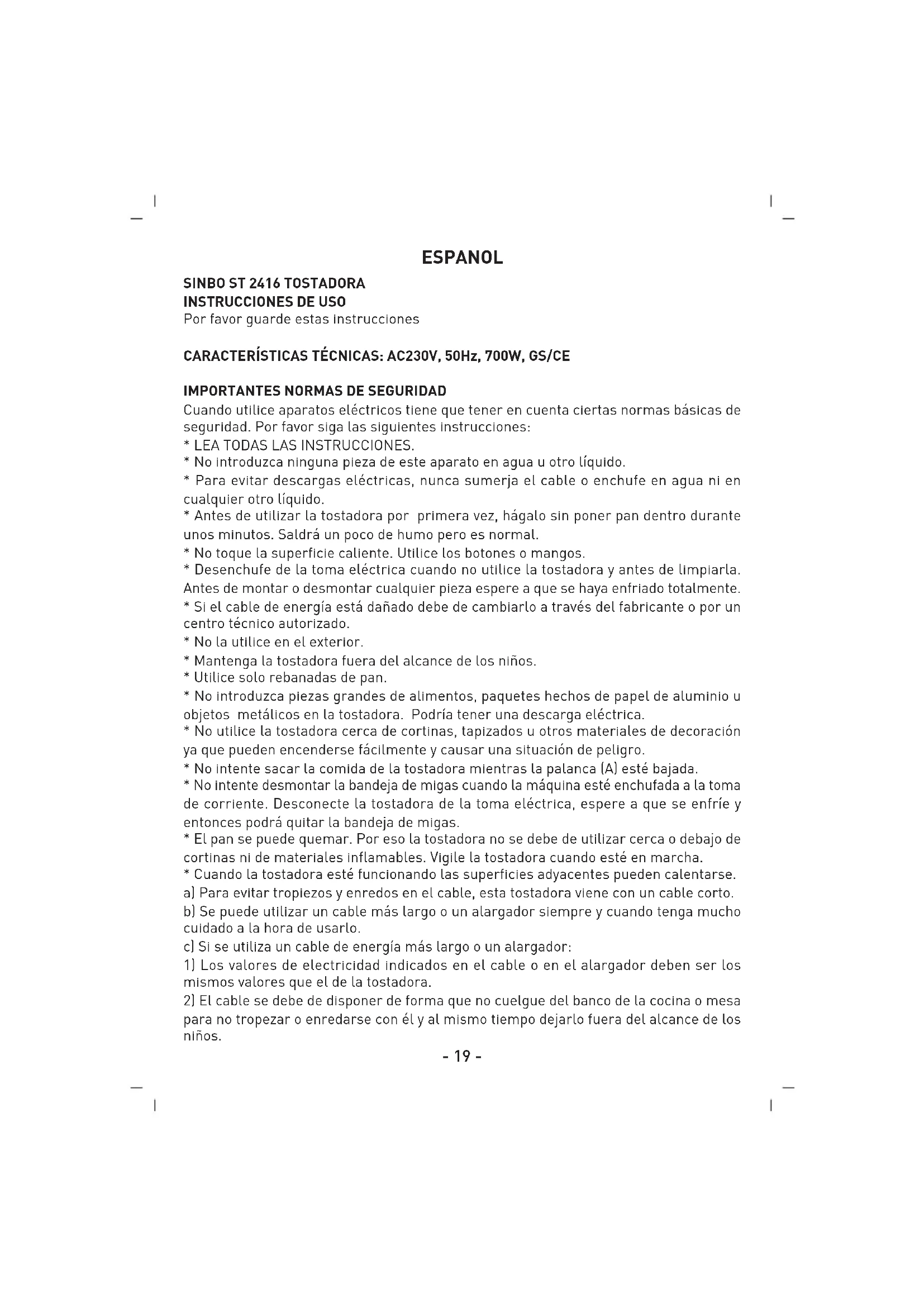 - Si el cable de la tostadora se avería, solo se debe cambiar por un técnico autorizado o por el fabricante.- 21 -