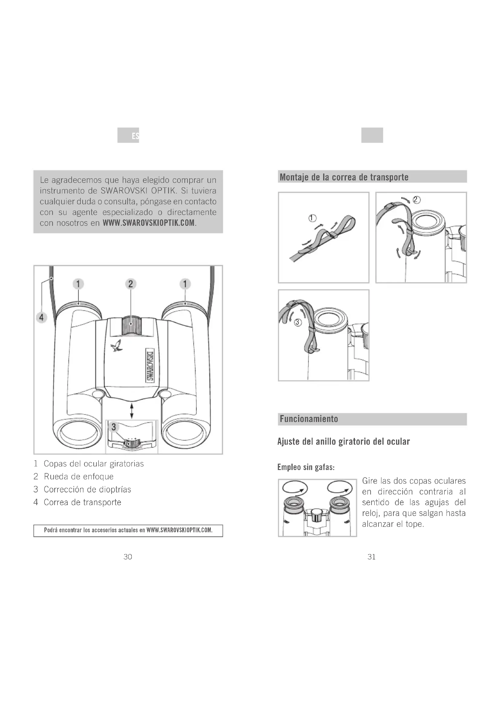 DE ESES Le agradecemos que haya elegido comprar un instrumento de SWAROVSKI OPTIK. Si tuviera cualquier duda o consulta, póngase en contacto con su agente especializado o directamente con nosotros en WWW.SWAROVSKIOPTIK.COM. Podrá encontrar los accesorios actuales en WWW.SWAROVSKIOPTIK.COM. 1 Copas del ocular giratorias 2 Rueda de enfoque 3 Corrección de dioptrías 4 Correa de transporte Montaje de la correa de transporte
