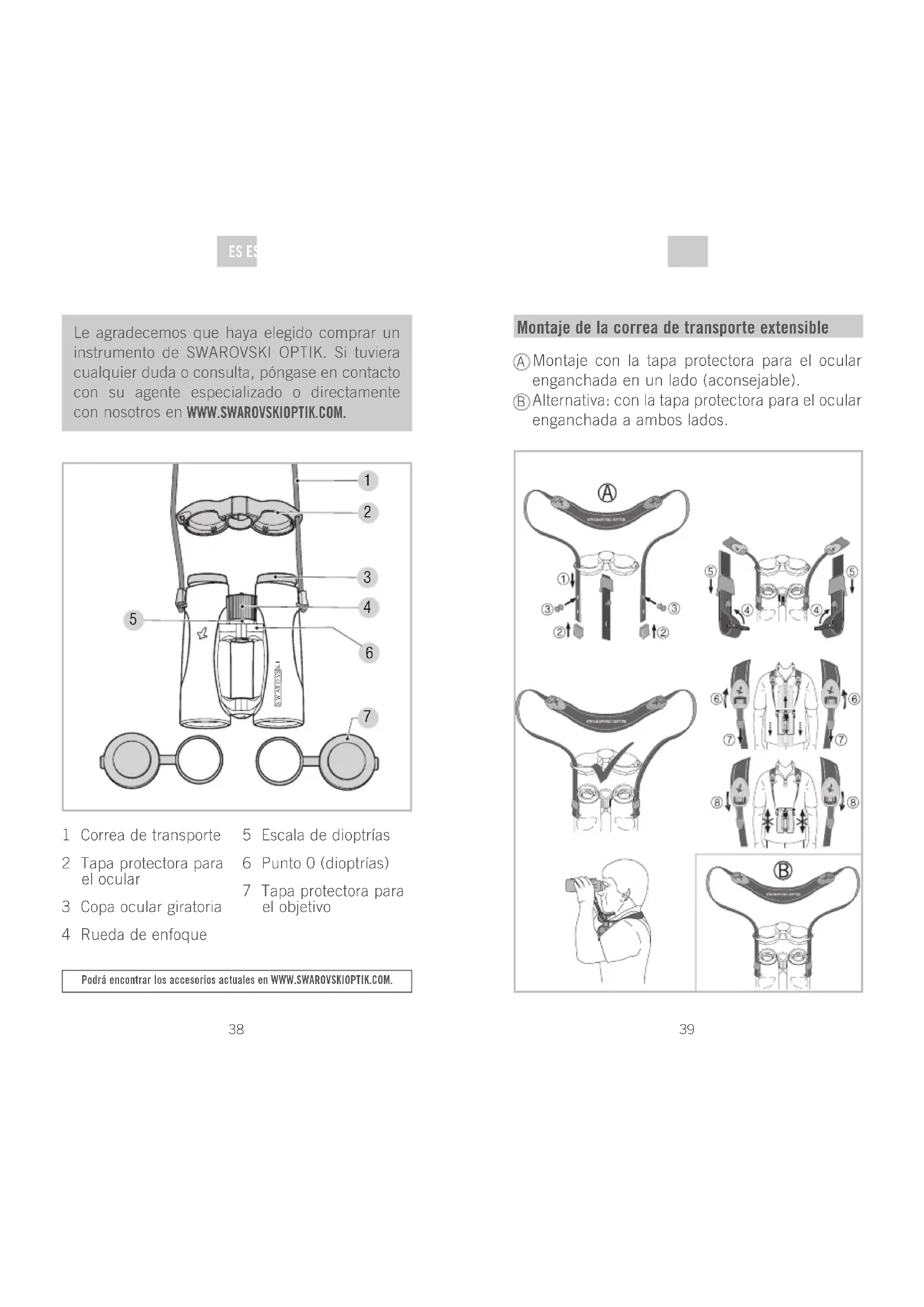 Le agradecemos que haya elegido comprar un instrumento de SWAROVSKI OPTIK. Si tuviera cualquier duda o consulta, póngase en contacto con su agente especializado o directamente con nosotros en WWW.SWAROVSKIOPTIK.COM. Podrá encontrar los accesorios actuales en WWW.SWAROVSKIOPTIK.COM. 1 Correa de transporte 2 Tapa protectora para el ocular 3 Copa ocular giratoria 4 Rueda de enfoque 5 Escala de dioptrías 6 Punto 0 (dioptrías) 7 Tapa protectora para el objetivo ES ES
