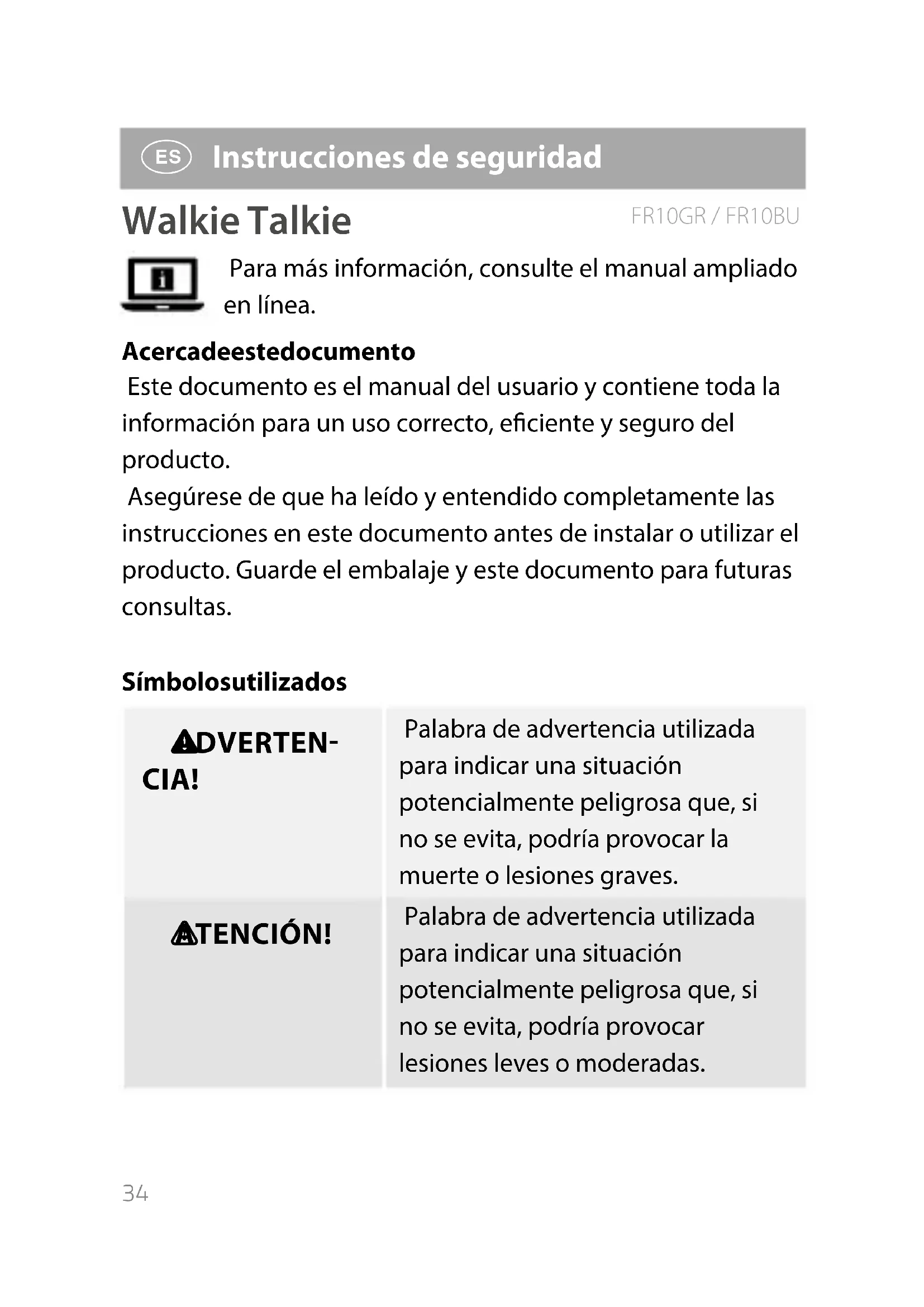 Instrucciones de seguridad Walkie Talkie FR10GR / FR10BU Para más información, consulte el manual ampliado en línea. Acerca de este documento Este documento es el manual del usuario y contiene toda la información para un uso correcto, eciente y seguro del producto. Asegúrese de que ha leído y entendido completamente las instrucciones en este documento antes de instalar o utilizar el producto. Guarde el embalaje y este documento para futuras consultas. Símbolos utilizados ADVERTEN- CIA! Palabra de advertencia utilizada para indicar una situación potencialmente peligrosa que, si no se evita, podría provocar la muerte o lesiones graves. ATENCIÓN! Palabra de advertencia utilizada para indicar una situación potencialmente peligrosa que, si no se evita, podría provocar lesiones leves o moderadas.35Alecto | Safety instructions AVISO Palabra de advertencia utilizada para abordar prácticas que no tienen que ver con lesiones físicas. Especicaciones Especicación Valor Potencia de entrada 5 V CC / 2000 mA (adaptador USB no incluido) Tipo de batería 3 × 1.2 V 800 mAh Uso previsto por el fabricante Este producto está concebido como un dispositivo de comunicación inalámbrica que permite a los usuarios comunicarse a distancias de hasta 6 km en condiciones de campo abierto. Este producto está diseñado para uso en interiores y en exteriores. Cualquier modicación del producto puede tener consecuencias para la seguridad, la garantía y el funcionamiento adecuado. Este producto no está diseñado para un uso profesional. Instrucciones de seguridad Asegúrese de que ha leído y entendido completamente las instrucciones en este documento antes de instalar o utilizar el producto. Guarde el embalaje y este documento para futuras consultas.36