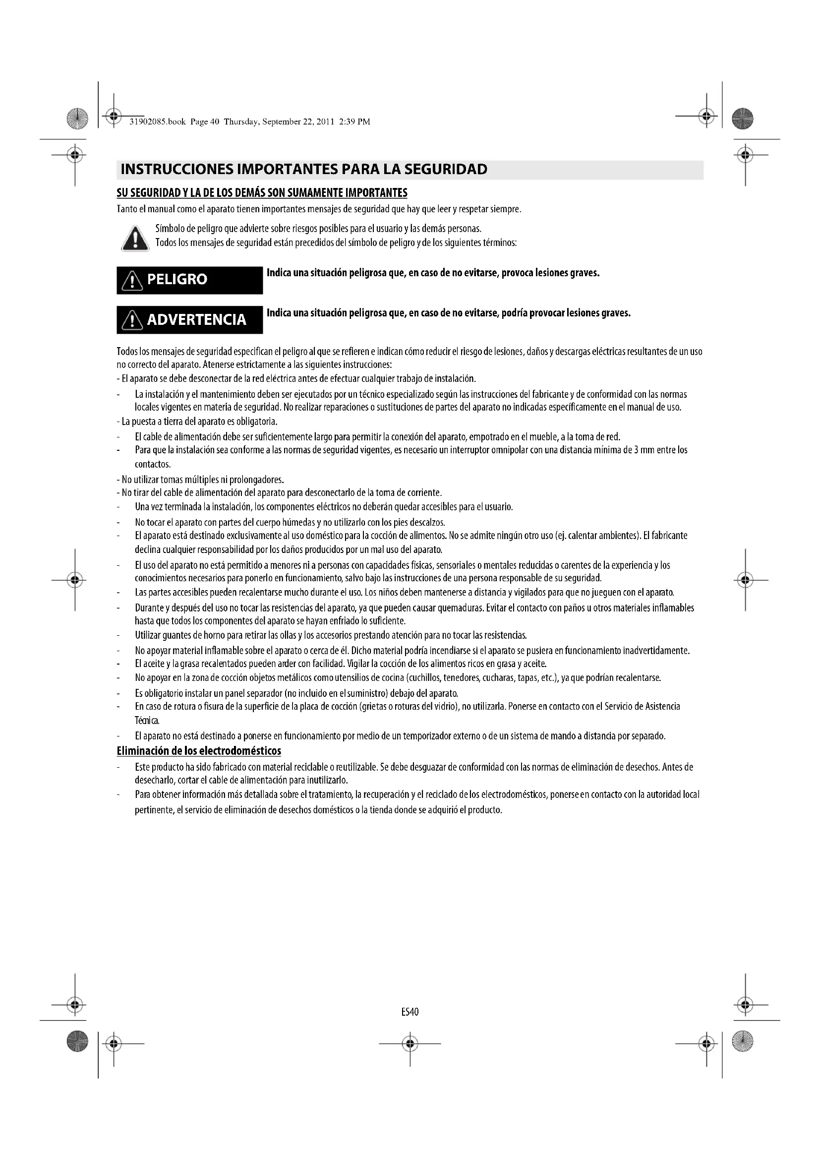 Símbolo de peligro que advierte sobre riesgos posibles para el usuario y las demás personas. Todos los mensajes de seguridad están precedidos del símbolo de peligro y de los siguientes términos: PELIGRO Indica una situación peligrosa que, en caso de no evitarse, provoca lesiones graves. ADVERTENCIA Indica una situación peligrosa que, en caso de no evitarse, podría provocar lesiones graves. ESPAÑOL Instalación Página 2 Instrucciones de uso Página 31902085.book Page 40 Thursday, September 22, 2011 2:39 PMES41 Eliminación del embalaje El material de embalaje es 100% reciclable y está marcado con el símbolo de reciclado ( ). Elimine los distintos tipos de material del embalaje conforme a la normativa local sobre eliminación de desechos. Eliminación del producto Este aparato lleva la marca CE de conformidad con la Directiva 2002/96/EC del Parlamento Europeo y del Consejo sobre desechos de aparatos eléctricos y electrónicos (RAEE). La correcta eliminación de este producto evita consecuencias negativas para el medio ambiente y la salud. El símbolo en el aparato o en la documentación que lo acompaña indica que no se puede tratar como desecho doméstico, sino que debe entregarse en un punto de recogida para el reciclado de aparatos eléctricos y electrónicos. Ahorro de energía Para obtener los mejores resultados: