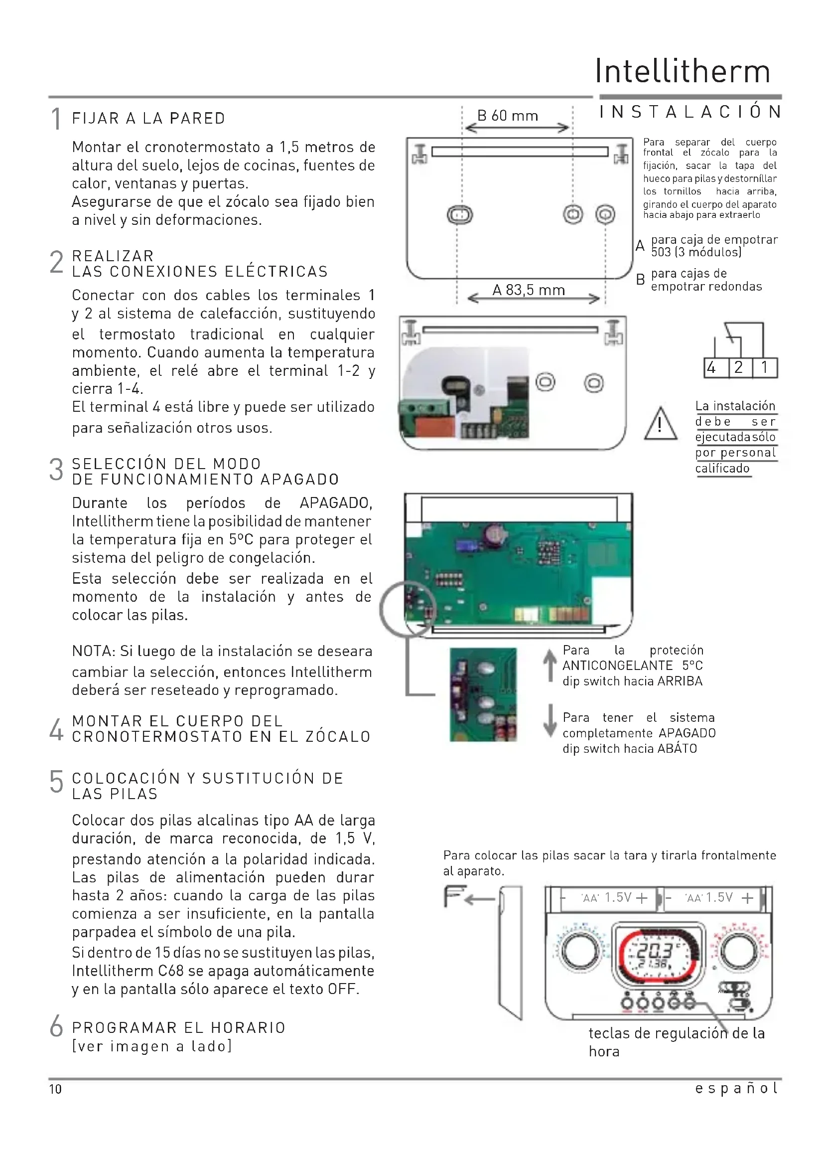 Intellitherm C68 starts the AIR-CONDITIONING mode moving the switch to the SUMMER position The comfort temperature can be regulated setting the COMFORT/TMAX knob. The red sectors on the ring indicate what time the air-conditioning is ON; the other colours indicate when the system is OFF. TECHNICAL DATA In compliance with EN 60730-1 and parts two. Contact rating 5 (3)A 250V c.a. Micro-disconnection (1BU). Software classe A. Voltage free switching contact. Temperature regulation: COMFORT from 16° to 34°C and ECONOMY from 5° to 23°C. Differential: +/- 0,25°C. Thermal gradient: 4°K/h. OFF mode with optional antifreeze protection (5°C) by a dip switch. Maximum room temperature: T45. double insulation. Protection degree IP20. Pollution degree 2. Impulse voltage 4000V. Power supply without connection to the electrical line with 2 AA 1,5V alkaline batteries (1 year battery life). Automatic control of the battery charge; the display will indicate if the charge is inadequate. Battery replacement without data dropout. Switch for the winter or summer operating modes. Reset key to restore the set program. Dimensions 135 x 85 x 19 mm. ErP classification: ErP Class IV; 2% (EU Reg. 811/2013 - 813/2013)4 MONTAR EL CUERPO DEL CRONOTERMOSTATO EN EL ZÓCALO COLOCACIÓN Y SUSTITUCIÓN DE LAS PILASColocar dos pilas alcalinas tipo AA de larga duración, de marca reconocida, de 1,5 V, prestando atención a la polaridad indicada. Las pilas de alimentación pueden durar hasta 2 años: cuando la carga de las pilas comienza a ser insuficiente, en la pantalla parpadea el símbolo de una pila. Si dentro de 15 días no se sustituyen las pilas, Intellitherm C68 se apaga automáticamente y en la pantalla sólo aparece el texto OFF.Para separar del cuerpo frontal el zócalo para la fijación, sacar la tapa del hueco para pilas y destorníllar los tornillos hacia arriba, girando el cuerpo del aparato hacia abajo para extraerlo REALIZAR LAS CONEXIONES ELÉCTRICASConectar con dos cables los terminales 1 y 2 al sistema de calefacción, sustituyendo el termostato tradicional en cualquier momento. Cuando aumenta la temperatura ambiente, el relé abre el terminal 1-2 y cierra 1-4. El terminal 4 está libre y puede ser utilizado para señalización otros usos. SELECCIÓN DEL MODO DE FUNCIONAMIENTO APAGADODurante los períodos de APAGADO, Intellitherm tiene la posibilidad de mantener la temperatura fija en 5ºC para proteger el sistema del peligro de congelación.Esta selección debe ser realizada en el momento de la instalación y antes de colocar las pilas.NOTA: Si luego de la instalación se deseara cambiar la selección, entonces Intellitherm deberá ser reseteado y reprogramado.Para la proteción ANTICONGELANTE 5°C dip switch hacia ARRIBAPara tener el sistema completamente APAGADO dip switch hacia ABÁTO FIJAR A LA PAREDLa instalación debe ser ejecutada sólo por personal calificadoMontar el cronotermostato a 1,5 metros de altura del suelo, lejos de cocinas, fuentes de calor, ventanas y puertas. Asegurarse de que el zócalo sea fijado bien a nivel y sin deformaciones.para caja de empotrar 503 (3 módulos)para cajas de empotrar redondas