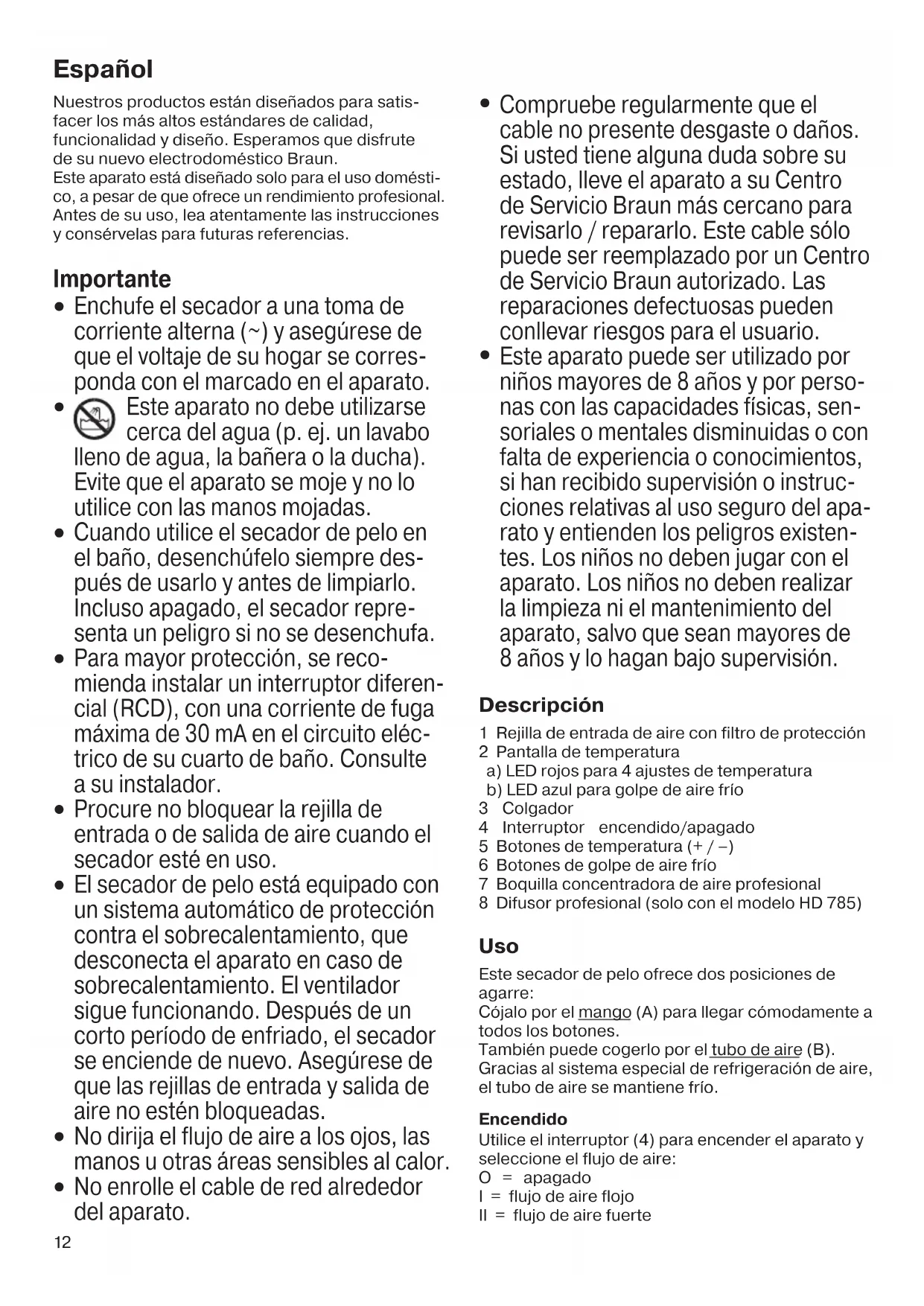 Este aparato puede ser utilizado por niños mayores de 8 años y por perso- nas con las capacidades físicas, sen- soriales o mentales disminuidas o con falta de experiencia o conocimientos, si han recibido supervisión o instruc- ciones relativas al uso seguro del apa- rato y entienden los peligros existen- tes. Los niños no deben jugar con el aparato. Los niños no deben realizar la limpieza ni el mantenimiento del aparato, salvo que sean mayores de 8 años y lo hagan bajo supervisión. Descripción 1 Rejilla de entrada de aire con filtro de protección 2 Pantalla de temperatura a) LED rojos para 4 ajustes de temperatura b) LED azul para golpe de aire frío 3 Colgador 4 Interruptor encendido/apagado 5 Botones de temperatura (+ / –) 6 Botones de golpe de aire frío 7 Boquilla concentradora de aire profesional 8 Difusor profesional (solo con el modelo HD 785) Uso Este secador de pelo ofrece dos posiciones de agarre: Cójalo por el mango (A) para llegar cómodamente a todos los botones. También puede cogerlo por el tubo de aire (B). Gracias al sistema especial de refrigeración de aire, el tubo de aire se mantiene frío. Encendido Utilice el interruptor (4) para encender el aparato y seleccione el flujo de aire: O = apagado I = flujo de aire flojo II = flujo de aire fuerte 96797320_HD785-780_S4-70.indd 1296797320_HD785-780_S4-70.indd 12 07.04.14 08:3807.04.14 08:38 CSS APPROVED Effective Date 8Apr2014 GMT - Printed 18Aug2014 Page 12 of 7013 Pantalla de temperatura (2) Los LED rojos (2a) muestran la selección de temperatura en un rango de 1 (baja) a 4 (alta). El LED azul (2b) se ilumina cuando se pulsa uno de los botones de golpe de aire frío (6). Ajuste de la temperatura Al encender el aparato, aparece por defecto el último ajuste de temperatura. Utilice los botones de temperatura (5) para cambiar la temperatura: Pulse el botón + para aumentar el ajuste de tempe- ratura. Pulse el botón – para reducir el ajuste de tempera- tura. Seleccione la temperatura en función de su sensi- bilidad al calor, tipo de cabello y nivel de hidrata- ción. Un sensor térmico integrado garantiza el máximo control del calor. Golpe de aire frío Los botones de golpe de aire frío (6) permiten cambiar al instante a un flujo de aire frío para fijar el peinado. Ambos botones ofrecen la misma función. Dependiendo de la forma que elija para sostener el aparato (A o B), puede pulsar el botón de golpe de aire frío más cercano. Independientemente de la temperatura inicial, conseguirá al instante un flujo de aire frío y el LED azul se iluminará. Pulse de nuevo uno de los botones de golpe de aire frío para seguir trabajando a la temperatura que muestran los LED rojos fijada previamente. Tecnología iónica (solo con el modelo HD 785) La corriente de aire se enriquece con millones de iones activos que envuelven cada pelo, reducen el encrespamiento y la electricidad estática. El pelo se moldea más fácilmente y se restaura el nivel de hidratación y el brillo natural. Para conseguir el máximo flujo de iones, use el secador de pelo sin accesorios o, al menos, finalice el moldeado sin accesorios. Uso de la boquilla concentradora de aire Para dar estilo al cabello, coloque la boquilla con- centradora de aire (7) en la parte frontal del aparato y presione firmemente hasta que encaje en su lugar. La boquilla concentradora de aire le permite dirigir el flujo de aire a zonas concretas del cabello. Tenga en cuenta que, a diferencia del tubo de aire, la boquilla concentradora de aire se calienta por el flujo de aire caliente. Uso del difusor (solo con el modelo HD 785) Para levantar las raíces, crear volumen u ondas naturales, coloque el difusor (8). Presiónela firme- mente sobre la salida de aire, hasta que encaje en su lugar (C). Pelo corto o media melena: Para aumentar el volumen y levantar las raíces, pase suavemente los dedos del difusor por el cuero cabelludo con pequeños movimientos circulares. Pelo largo: Primero seque las puntas colocándolas sobre la placa del difusor. A continuación, levante el cabello hacia el cuero cabelludo con el difusor. Para añadir volumen a las raíces, pase suavemente los dedos del difusor por el cuero cabelludo con pequeños movimientos circulares. Limpieza Antes de la limpieza, desenchufe el aparato y deje que se enfríe. Para limpiar la carcasa, utilice solo un paño húmedo. No utilice nunca productos de limpieza agresivos o abrasivos. No utilice nunca objetos puntiagudos (p. ej., la púa de un peine) para eliminar polvo o cuerpos extraños del interior del aparato. Existe riesgo de descarga eléctrica. Limpie periódicamente el exterior del filtro de pro- tección (1) con un paño húmedo (D). Para una limpieza a fondo, gire el filtro de protec- ción hacia la izquierda y retírelo (E). Limpie el filtro de protección con agua corriente y deje que se seque por completo. Reemplace el filtro de protec- ción y fíjelo girando hacia la derecha. Almacenamiento El colgador (3) le permite almacenar el secador de pelo de forma práctica y segura. Eliminación El producto contiene residuos electrónicos reciclables. Para proteger el medio ambiente, no lo tire a la basura doméstica. Llévelo al punto de recogida local apropiado. Sujeto a modificaciones sin previo aviso. 96797320_HD785-780_S4-70.indd 1396797320_HD785-780_S4-70.indd 13 07.04.14 08:3807.04.14 08:38 CSS APPROVED Effective Date 8Apr2014 GMT - Printed 18Aug2014 Page 13 of 7014 Garantía Braun concede a este producto 2 años de garantía a partir de la fecha de compra. Dentro del periodo de garantía, subsanaremos, sin cargo alguno, cualquier defecto del aparato imputable tanto a los materiales como a la fabricación, ya sea reparando, sustituyendo piezas, o facilitando un aparato nuevo según nuestro criterio. La garantía no ampara averías por uso indebido, funcionamiento a distinto voltaje del indicado, conexión a un enchufe inadecuado, rotura, desgaste normal por el uso que causen defectos o una disminu