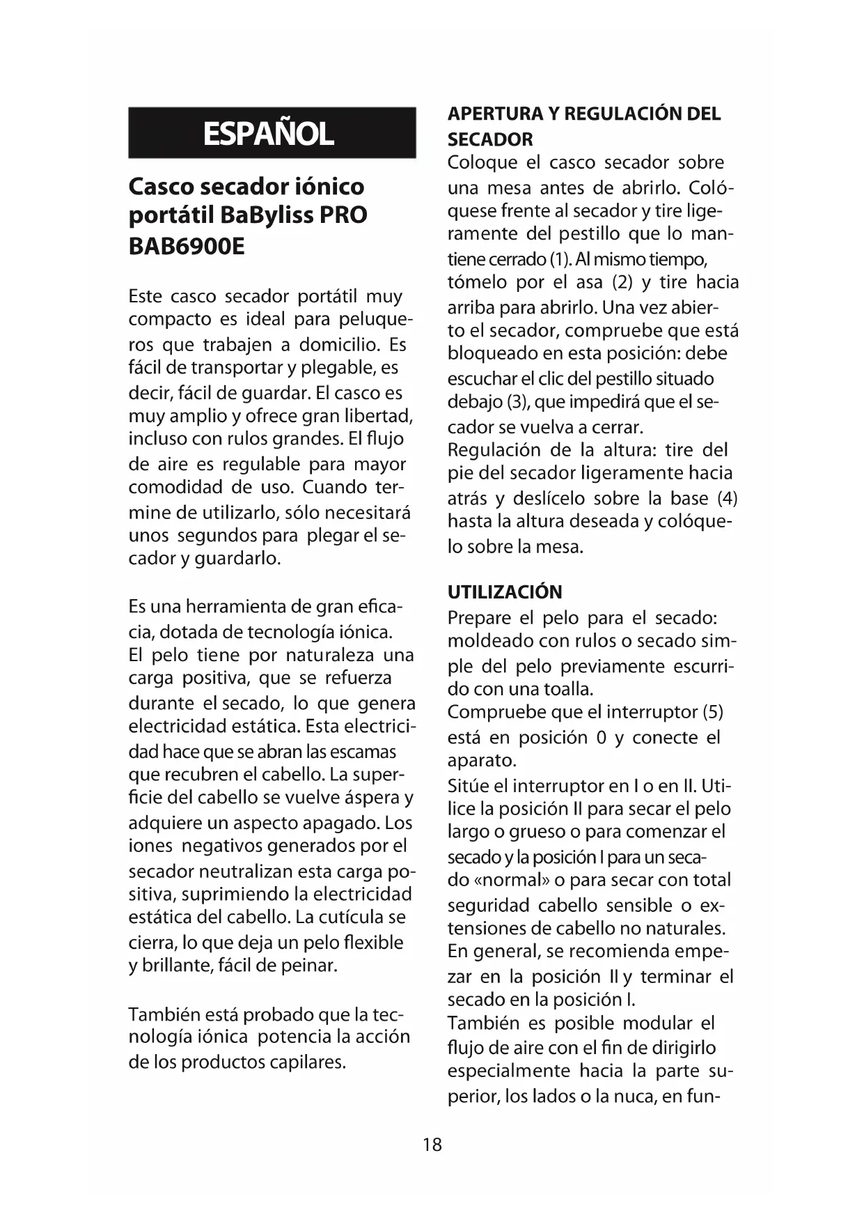 - utilizzare i sistemi di recu- pero e raccolta messi a vostra dispo- sizione. In questo modo sarà possibile riciclare o valorizzare alcuni ma- teriali.18 ESPAÑOL Casco secador iónico portátil BaByliss PRO BAB6900E Este casco secador portátil muy compacto es ideal para peluque- ros que trabajen a domicilio. Es fácil de transportar y plegable, es decir, fácil de guardar. El casco es muy amplio y ofrece gran libertad, incluso con rulos grandes. El flujo de aire es regulable para mayor comodidad de uso. Cuando ter- mine de utilizarlo, sólo necesitará unos segundos para plegar el se- cador y guardarlo. Es una herramienta de gran efica- cia, dotada de tecnología iónica. El pelo tiene por naturaleza una carga positiva, que se refuerza durante el secado, lo que genera electricidad estática. Esta electrici- dad hace que se abran las escamas que recubren el cabello. La super- ficie del cabello se vuelve áspera y adquiere un aspecto apagado. Los iones negativos generados por el secador neutralizan esta carga po- sitiva, suprimiendo la electricidad estática del cabello. La cutícula se cierra, lo que deja un pelo flexible y brillante, fácil de peinar. También está probado que la tec- nología iónica potencia la acción de los productos capilares.