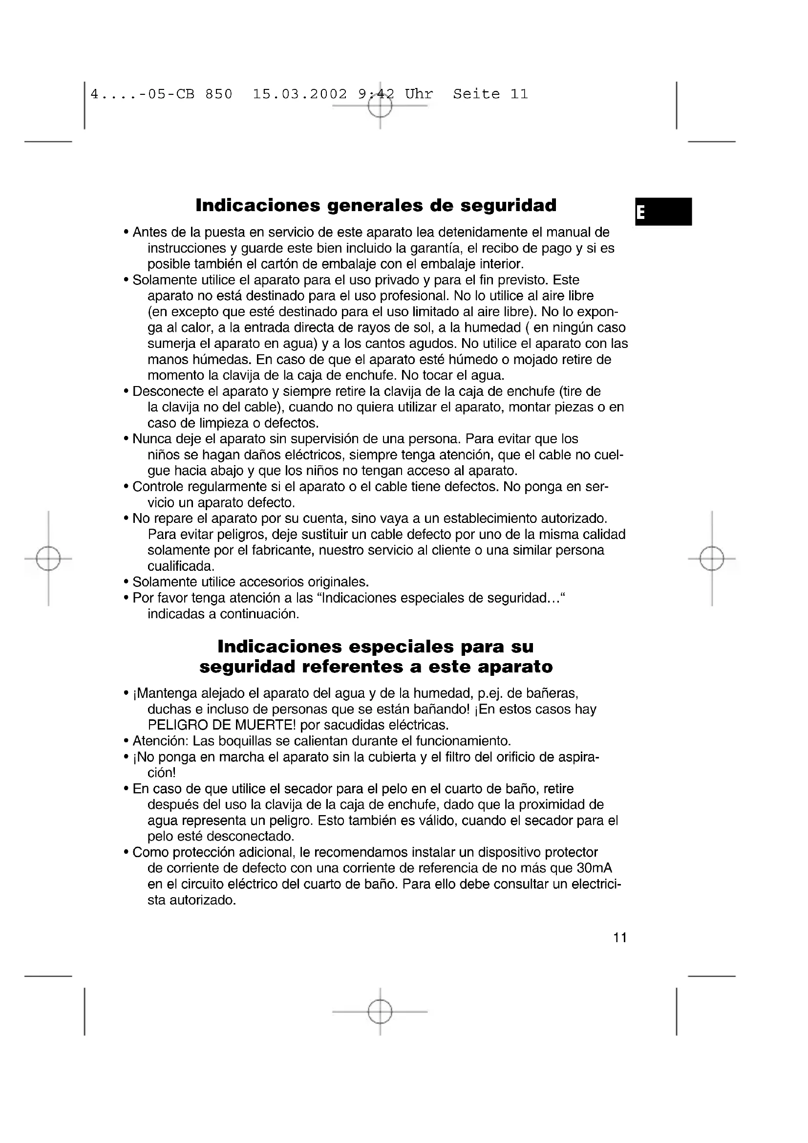 - Por favor tenga atención a las “Indicaciones especiales de seguridad…“ indicadas a continuación. Indicaciones especiales para su seguridad referentes a este aparato