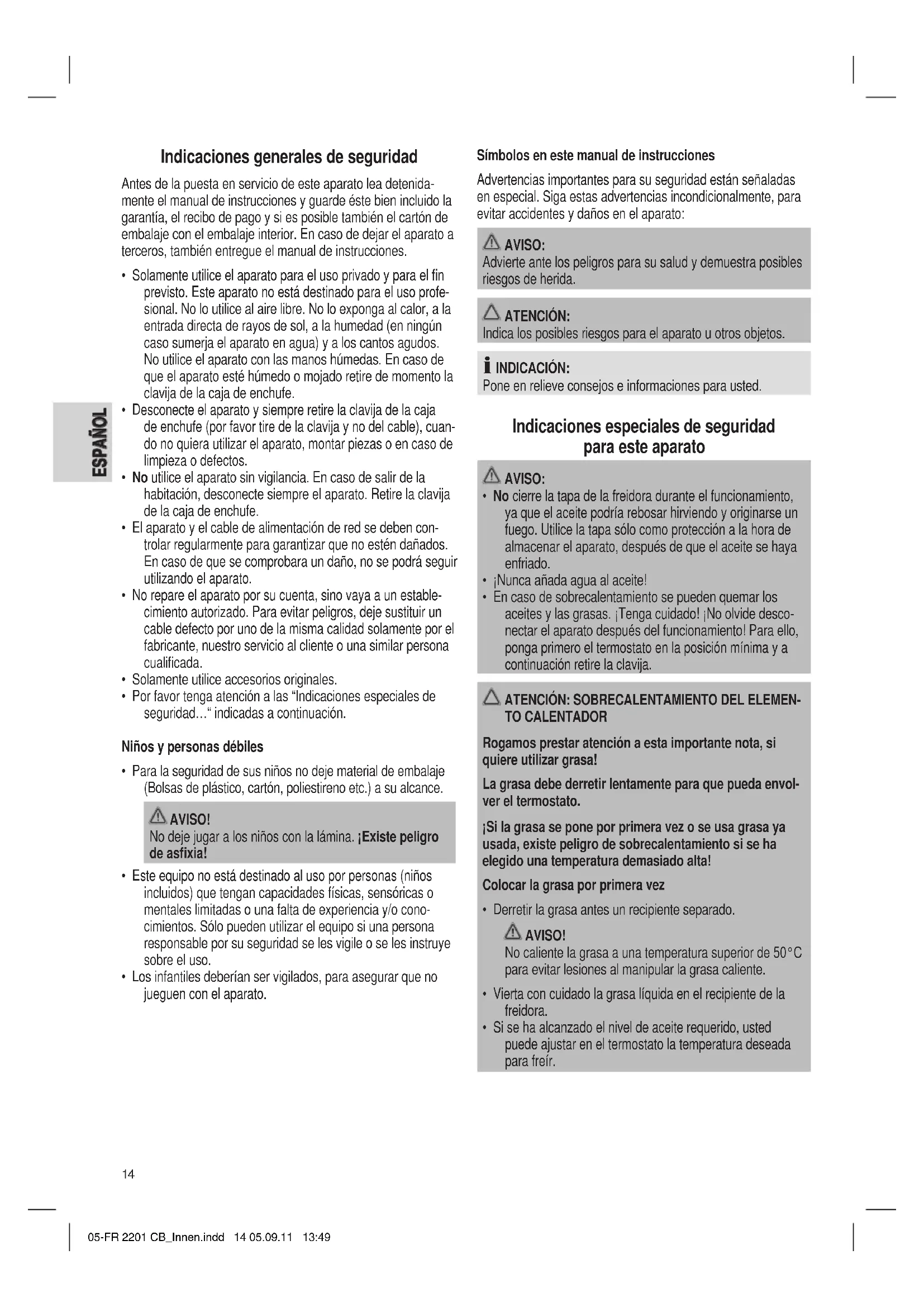 - Si se ha alcanzado el nivel de aceite requerido, usted puede ajustar en el termostato la temperatura deseada para freír. 05-FR 2201 CB_Innen.indd 14 05.09.11 13:4915 ESPAÑOL Recalentamiento de grasa endurecida en la freidora Si la grasa se ha endurecido en la freidora apenas podrá constatar si ya está derretida abajo donde está la calefacción.
