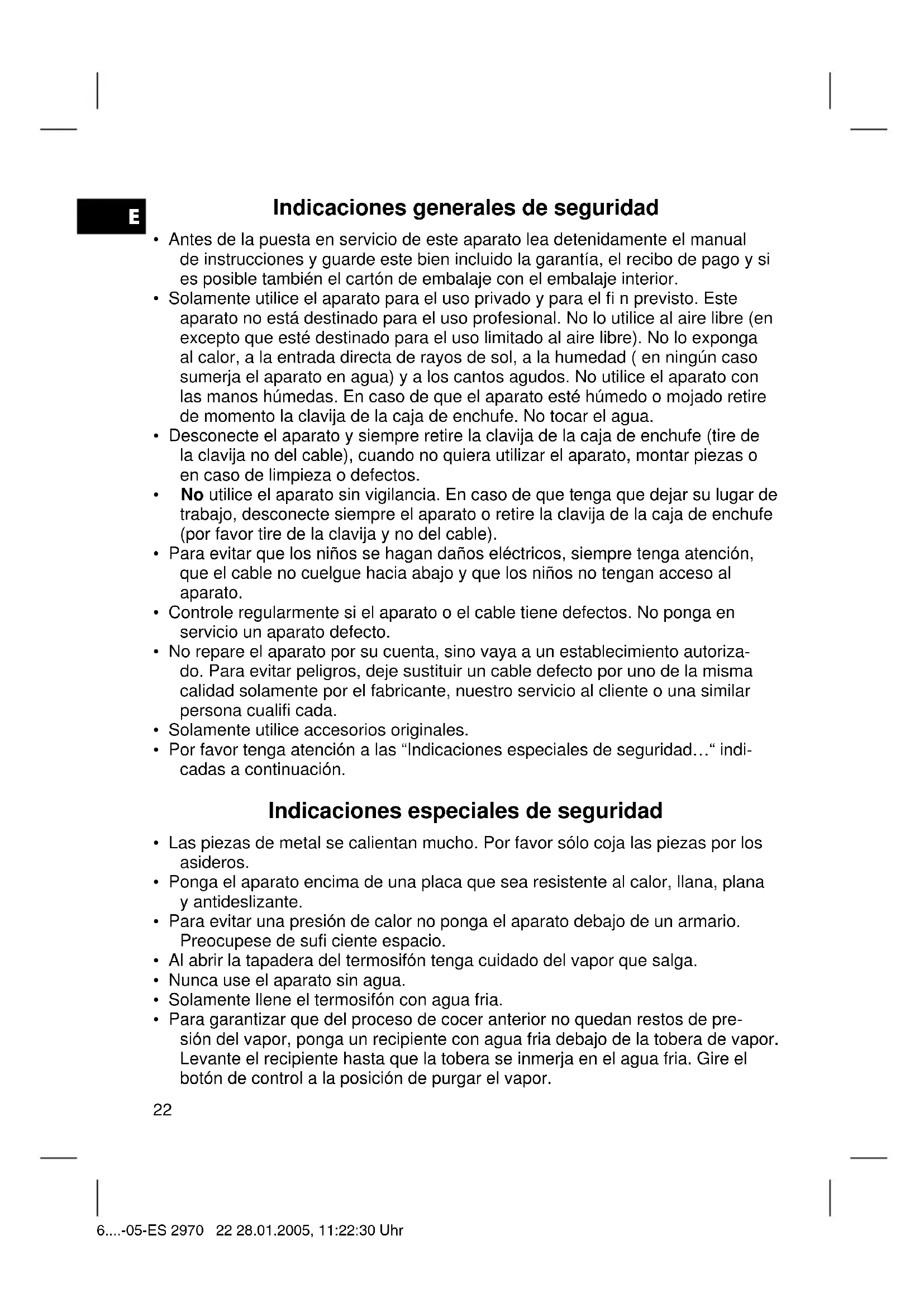 - En caso de que la tapadera del termosifón se desentornille mal, puede ser una señal que en el aparato exista todavia presión de vapor. Purgue el vapor con el procedimiento, que se ha explicado anteriormente. Indicación de los elementos de manejo 1Tapadera del termosifón12Parilla para el goteo 2 Apertura de depósito del termosifón 13 Base 3 Botón de control 14 Hervir 4 Termosifón 15 Salida de vapor 5 Visualizador de funcionamiento 16 Desconectado 6 Pieza para hervir 17 Tubito de vapor 7 Recipiente para el fi ltro 18 Tobera de vapor 8 Portafi ltro 19 Abierto – Posición de asa para 9 Seguro del fi ltro introducir el sistema del fi ltro 10 Asa del fi ltro 20 Cerrado – Posición de asa 11 Boquilla del fi ltro para bloquear el sistema del fi ltro Antes del primer uso Para quitar todo el polvo que se podría haber acumulado durante el embalaje, enjuague con agua caliente y jabón la jarrita de vidrio, el recipiente del fi ltro, el soporte del fi ltro y la bandeja de goteo. Por favor no utilice detergentes fuertes ! El pie puede limpiarlo con un paño limpio y húmedo. Tenga atención de estas indicaciones de seguridad! Antes de iniciar la primera cocción de espresso o café, le recomendamos que realice una cocción completa sin polvos de café como explicado bajo „Prepara- ción de espresso“. Así se garantiza que todo el polvo que haya cogido la máquina sea quitado. La preparación de espresso y cappuccino es diferente que la de café normal. El espresso igual que el cappuccino se preparan apretando bajo presión el agua cocida en el café molido. Para esto es necesario un poco de atención y le recomendamos leer detenidamente todas las instrucciones y indicaciones de seguridad antes de empezar a cocer. 6....-05-ES 2970 23 28.01.2005, 11:22:30 UhrE