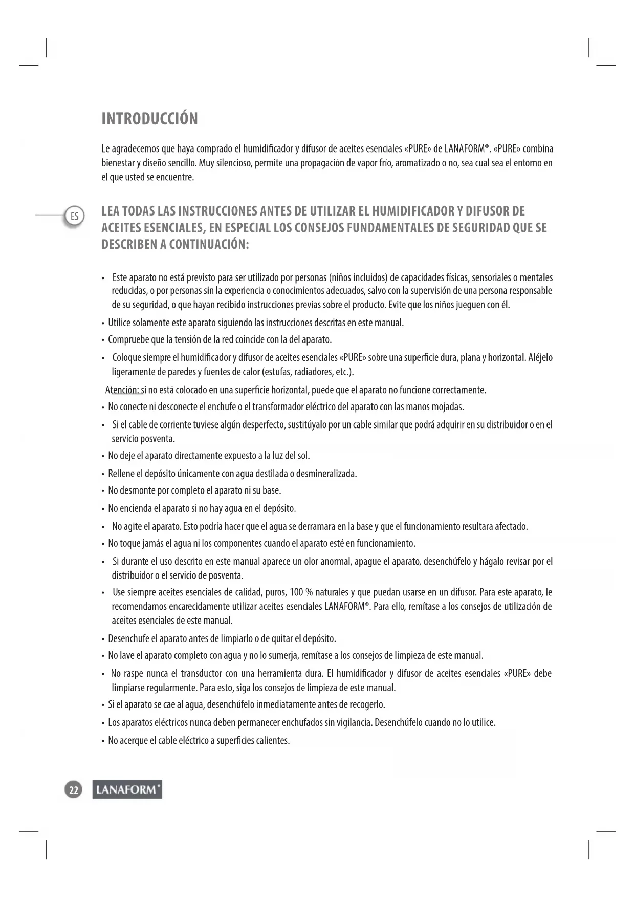 INTRODUCCIÓN Le agradecemos que haya comprado el humidicador y difusor de aceites esenciales «PURE» de LANAFORM®. «PURE» combina bienestar y diseño sencillo. Muy silencioso, permite una propagación de vapor frío, aromatizado o no, sea cual sea el entorno en el que usted se encuentre. LEA TODAS LAS INSTRUCCIONES ANTES DE UTILIZAR EL HUMIDIFICADOR Y DIFUSOR DE ACEITES ESENCIALES, EN ESPECIAL LOS CONSEJOS FUNDAMENTALES DE SEGURIDAD QUE SE DESCRIBEN A CONTINUACIÓN: