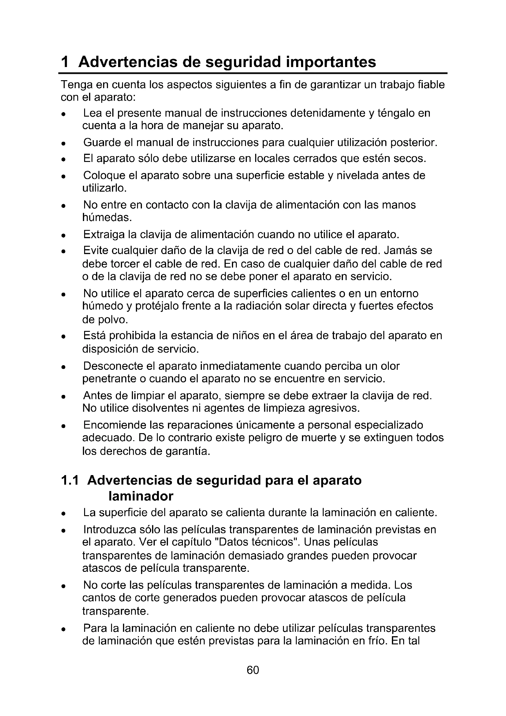 1.1 Advertencias de seguridad para el aparato laminador ............ 60