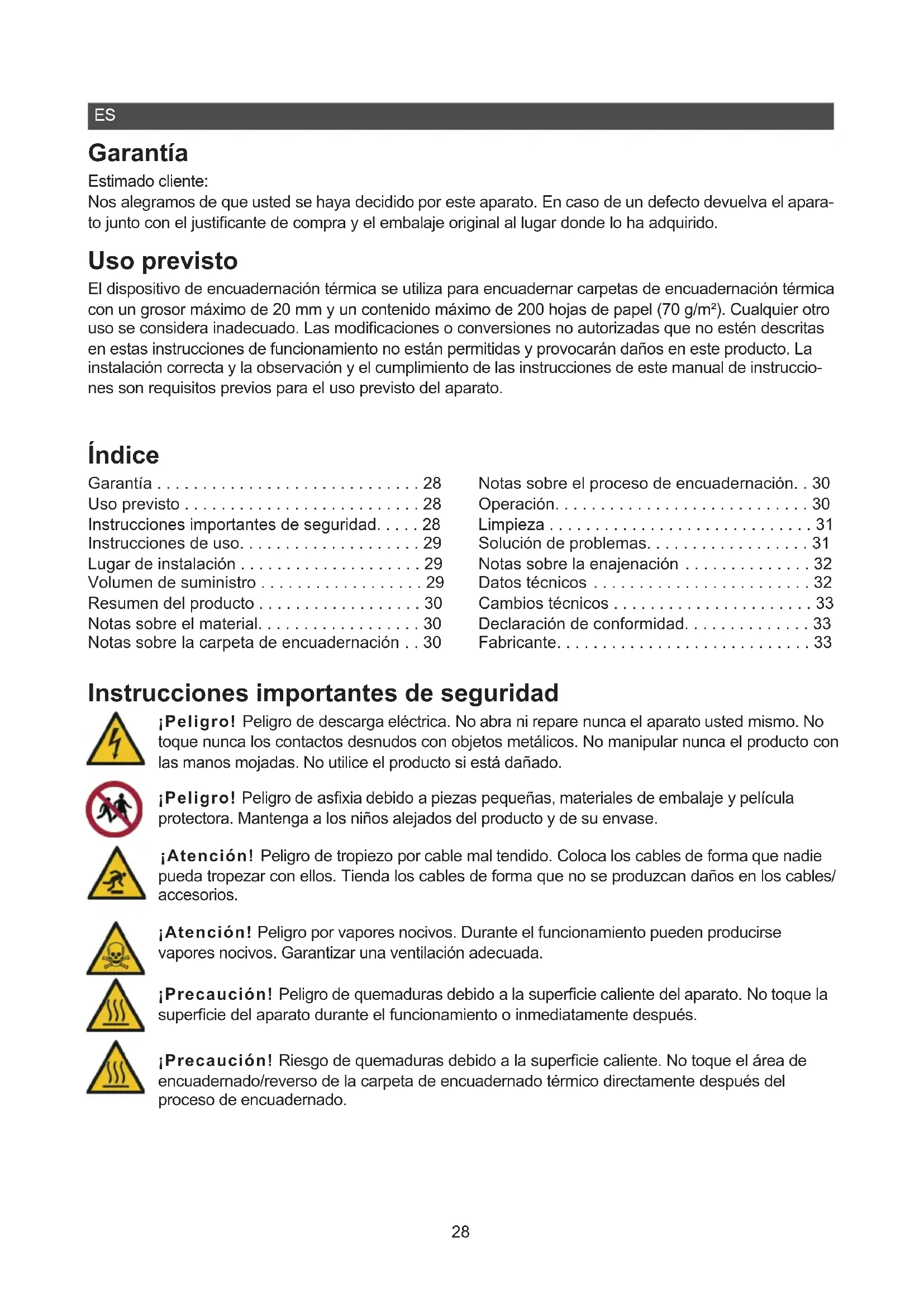 - Garantía Estimado cliente: Nos alegramos de que usted se haya decidido por este aparato. En caso de un defecto devuelva el apara- to junto con el justicante de compra y el embalaje original al lugar donde lo ha adquirido. Uso previsto El dispositivo de encuadernación térmica se utiliza para encuadernar carpetas de encuadernación térmica con un grosor máximo de 20 mm y un contenido máximo de 200 hojas de papel (70 g/m²). Cualquier otro uso se considera inadecuado. Las modicaciones o conversiones no autorizadas que no estén descritas en estas instrucciones de funcionamiento no están permitidas y provocarán daños en este producto. La instalación correcta y la observación y el cumplimiento de las instrucciones de este manual de instruccio- nes son requisitos previos para el uso previsto del aparato. Índice Garantía p. 28