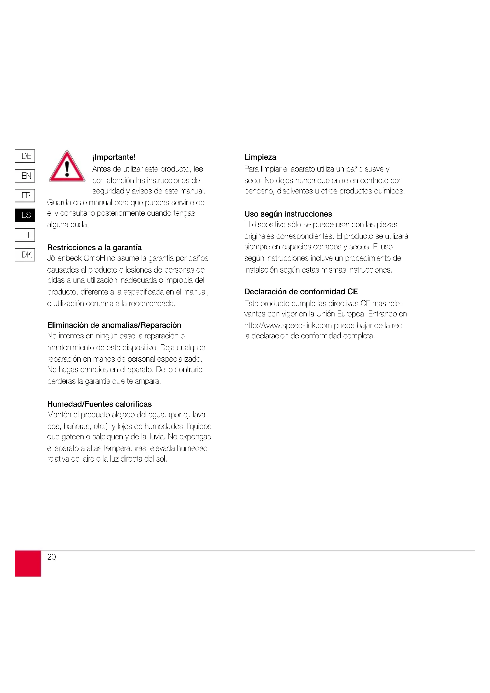 ¡Importante! Antes de utilizar este producto, lee con atención las instrucciones de seguridad y avisos de este manual. Guarda este manual para que puedas servirte de él y consultarlo posteriormente cuando tengas alguna duda. Restricciones a la garantía Jöllenbeck GmbH no asume la garantía por daños causados al producto o lesiones de personas de- bidas a una utilización inadecuada o impropia del producto, diferente a la especificada en el manual, o utilización contraria a la recomendada. Eliminación de anomalías/Reparación No intentes en ningún caso la reparación o mantenimiento de este dispositivo. Deja cualquier reparación en manos de personal especializado. No hagas cambios en el aparato. De lo contrario perderás la garantía que te ampara. Humedad/Fuentes caloríficas Mantén el producto alejado del agua. (por ej. lava- bos, bañeras, etc.), y lejos de humedades, líquidos que goteen o salpiquen y de la lluvia. No expongas el aparato a altas temperaturas, elevada humedad relativa del aire o la luz directa del sol. Limpieza Para limpiar el aparato utiliza un paño suave y seco. No dejes nunca que entre en contacto con benceno, disolventes u otros productos químicos. Uso según instrucciones El dispositivo sólo se puede usar con las piezas originales correspondientes. El producto se utilizará siempre en espacios cerrados y secos. El uso según instrucciones incluye un procedimiento de instalación según estas mismas instrucciones. Declaración de conformidad CE Este producto cumple las directivas CE más rele- vantes con vigor en la Unión Europea. Entrando en http://www.speed-link.com puede bajar de la red la declaración de conformidad completa.DE
