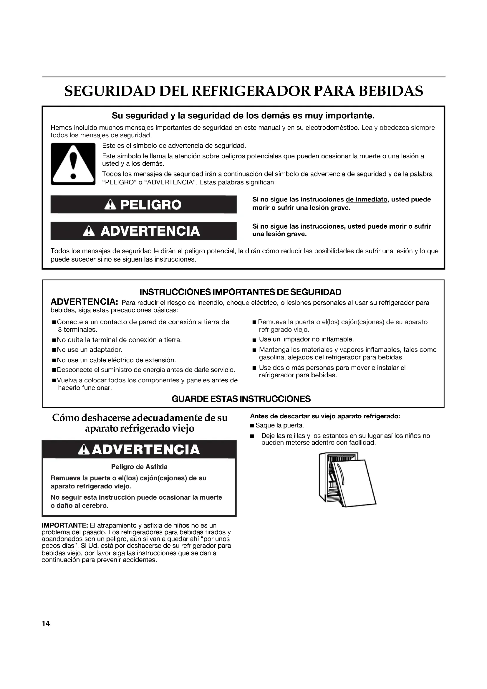 Cómo deshacerse adecuadamente de su aparato refrigerado viejo IMPORTANTE: El atrapamiento y asfixia de niños no es un problema del pasado. Los refrigeradores para bebidas tirados y abandonados son un peligro, aún si van a quedar ahí “por unos pocos días”. Si Ud. está por deshacerse de su refrigerador para bebidas viejo, por favor siga las instrucciones que se dan a continuación para prevenir accidentes.Antes de descartar su viejo aparato refrigerado:■ Saque la puerta. ■ Deje las rejillas y los estantes en su lugar así los niños no pueden meterse adentro con facilidad.Si no sigue las instrucciones de inmediato, usted puede morir o sufrir una lesión grave. Si no sigue las instrucciones, usted puede morir o sufrir una lesión grave. Todos los mensajes de seguridad le dirán el peligro potencial, le dirán cómo reducir las posibilidades de sufrir una lesión y lo que puede suceder si no se siguen las instrucciones. Su seguridad y la seguridad de los demás es muy importante. Hemos incluido muchos mensajes importantes de seguridad en este manual y en su electrodoméstico. Lea y obedezca siempre todos los mensajes de seguridad. ADVERTENCIA PELIGRO Este es el símbolo de advertencia de seguridad.Este símbolo le llama la atención sobre peligros potenciales que pueden ocasionar la muerte o una lesión a usted y a los demás.Todos los mensajes de seguridad irán a continuación del símbolo de advertencia de seguridad y de la palabra “PELIGRO” o “ADVERTENCIA”. Estas palabras significan: