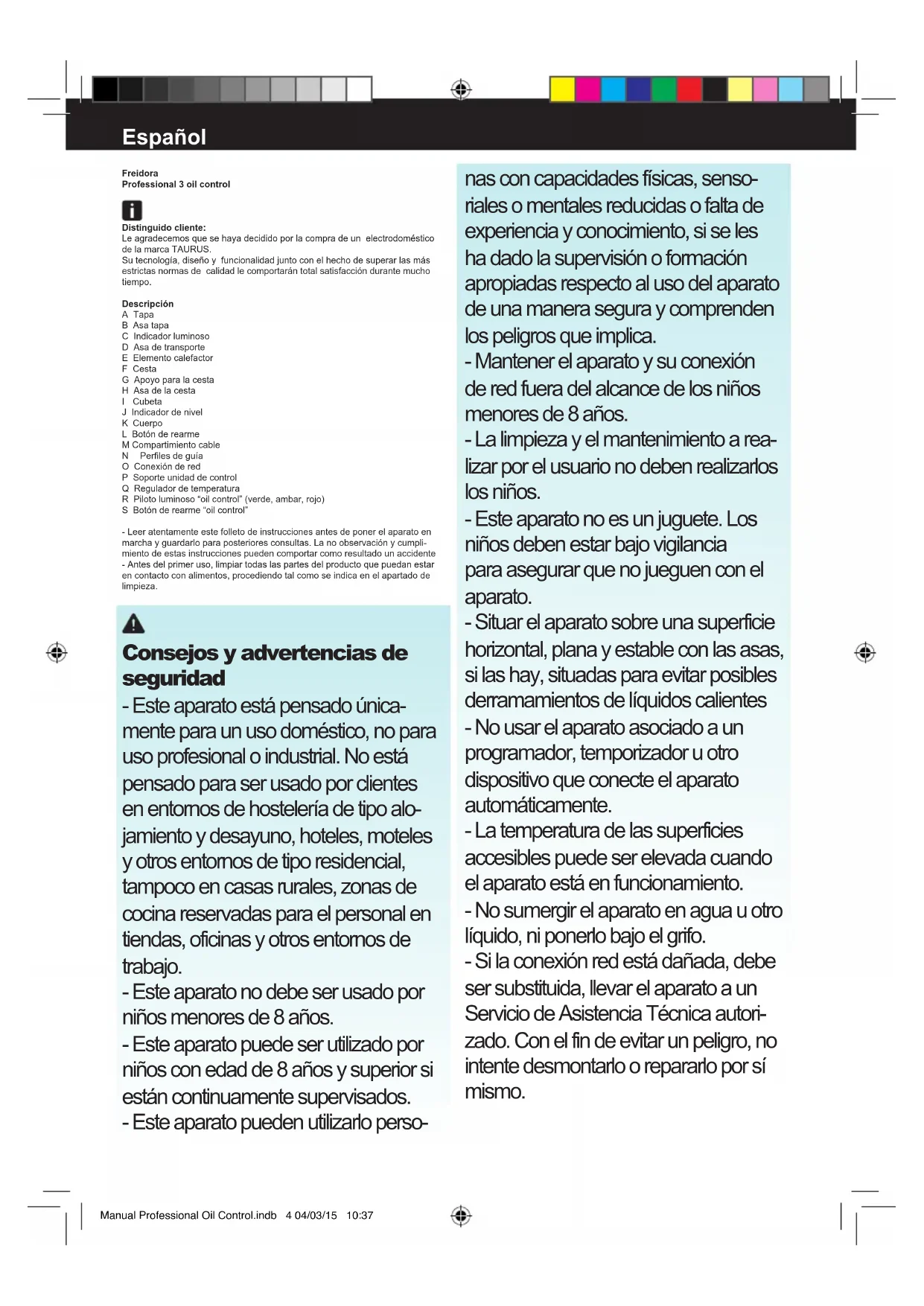 Manual Professional Oil Control.indb 2 04/03/15 10:37Fig.1 Fig.3 Fig.2 Manual Professional Oil Control.indb 3 04/03/15 10:37Español Freidora Professional 3 oil control Distinguido cliente: Le agradecemos que se haya decidido por la compra de un electrodoméstico de la marca TAURUS. Su tecnología, diseño y funcionalidad junto con el hecho de superar las más estrictas normas de calidad le comportarán total satisfacción durante mucho tiempo. Descripción A Tapa B Asa tapa C Indicador luminoso D Asa de transporte E Elemento calefactor F Cesta G Apoyo para la cesta H Asa de la cesta I Cubeta J Indicador de nivel K Cuerpo L Botón de rearme M Compartimiento cable N Perlesdeguía O Conexión de red P Soporte unidad de control Q Regulador de temperatura R Piloto luminoso “oil control” (verde, ambar, rojo) S Botón de rearme “oil control” - Leer atentamente este folleto de instrucciones antes de poner el aparato en marcha y guardarlo para posteriores consultas. La no observación y cumpli- miento de estas instrucciones pueden comportar como resultado un accidente - Antes del primer uso, limpiar todas las partes del producto que puedan estar en contacto con alimentos, procediendo tal como se indica en el apartado de limpieza. Consejos y advertencias de seguridad - Este aparato está pensado única- mente para un uso doméstico, no para uso profesional o industrial. No está pensado para ser usado por clientes en entornos de hostelería de tipo alo- jamiento y desayuno, hoteles, moteles y otros entornos de tipo residencial, tampoco en casas rurales, zonas de cocina reservadas para el personal en tiendas, oficinas y otros entornos de trabajo. - Este aparato no debe ser usado por niños menores de 8 años. - Este aparato puede ser utilizado por niños con edad de 8 años y superior si están continuamente supervisados. - Este aparato pueden utilizarlo perso- nas con capacidades físicas, senso- riales o mentales reducidas o falta de experiencia y conocimiento, si se les ha dado la supervisión o formación apropiadas respecto al uso del aparato de una manera segura y comprenden los peligros que implica. - Mantener el aparato y su conexión de red fuera del alcance de los niños menores de 8 años. - La limpieza y el mantenimiento a rea- lizar por el usuario no deben realizarlos los niños. - Este aparato no es un juguete. Los niños deben estar bajo vigilancia para asegurar que no jueguen con el aparato. - Situar el aparato sobre una superficie horizontal, plana y estable con las asas, si las hay, situadas para evitar posibles derramamientos de líquidos calientes - No usar el aparato asociado a un programador, temporizador u otro dispositivo que conecte el aparato automáticamente. - La temperatura de las superficies accesibles puede ser elevada cuando el aparato está en funcionamiento. - No sumergir el aparato en agua u otro líquido, ni ponerlo bajo el grifo. - Si la conexión red está dañada, debe ser substituida, llevar el aparato a un Servicio de Asistencia Técnica autori- zado. Con el fin de evitar un peligro, no intente desmontarlo o repararlo por sí mismo. Manual Professional Oil Control.indb 4 04/03/15 10:37-Antesdeconectarelaparatoalared,vericarqueelvoltajeindicadoenla placa de características coincide con el voltaje de red. - Conectar el aparato a una base de toma de corriente provista de toma de tierra y que soporte como mínimo 10 amperios. - La clavija del aparato debe coincidir con la base eléctrica de la toma de corriente.Nuncamodicarlaclavija.Nousaradaptadoresdeclavija. - No forzar el cable eléctrico de conexión. Nunca usar el cable eléctrico para levantar, transportar o desenchufar el aparato. - No enrollar el cable eléctrico de conexión alrededor del aparato. - No dejar que el cable eléctrico de conexión quede colgando de la mesa o quedeencontactoconlassuperciescalientesdelaparato. -Vericarelestadodelcableeléctricodeconexión.Loscablesdañadoso enredados aumentan el riesgo de choque eléctrico. - No tocar la clavija de conexión con las manos mojadas. - No utilizar el aparato con el cable eléctrico o la clavija dañada. - Si alguna de las envolventes del aparato se rompe, desconectar inmedia- tamente el aparato de la red para evitar la posibilidad de sufrir un choque eléctrico. - No utilizar el aparato si ha caído, si hay señales visibles de daños, o si existe fuga - Este aparato no es adecuado para uso en exteriores. - Mantener el área de trabajo limpia y bien iluminada. Las áreas desordenadas y oscuras son propensas a que ocurran accidentes. -No forzar el cable eléctrico de conexión. Nunca usar el cable eléctrico para levantar, transportar o desenchufar el aparato. -No utilizar ni guardar el aparato a la intemperie. Utilización y cuidados - Antes de cada uso, desenrollar completamente el cable de alimentación del aparato. - No poner el aparato en marcha sin haber llenado antes la cubeta de aceite - No usar el aparato si su dispositivo de puesta en marcha/paro no funciona. - No mover el aparato mientras está en uso. - No desplazar el aparato cuando esté funcionando o el aceite aún esté calien- te. Con el aparato en frío, transportar el aparato haciendo uso de las asas. - Hacer uso del asa/s para coger o transportar el aparato. - No dar la vuelta al aparato mientras está en uso o conectado a la red. - Respetar los niveles MAX y MIN. (Fig 1) - Desenchufar el aparato de la red cuando no se use y antes de realizar cualquier operación de limpieza. - Guardar este aparato fuera del alcance de los niños y/o personas discapa- citadas. - No guardar ni transportar el aparato si todavía está caliente. - Usar siempre el aparato bajo vigilancia. - No dejar nunca el aparato funcionando sin vigilancia, ni al alcance de los niños, ya que es un aparato eléctrico que calienta aceite a altas temperaturas y puede ocasionar quemaduras graves. - Si se utiliza materia grasa en vez de aceite, se tiene que fundir ésta previa- mente en un recipiente apa
