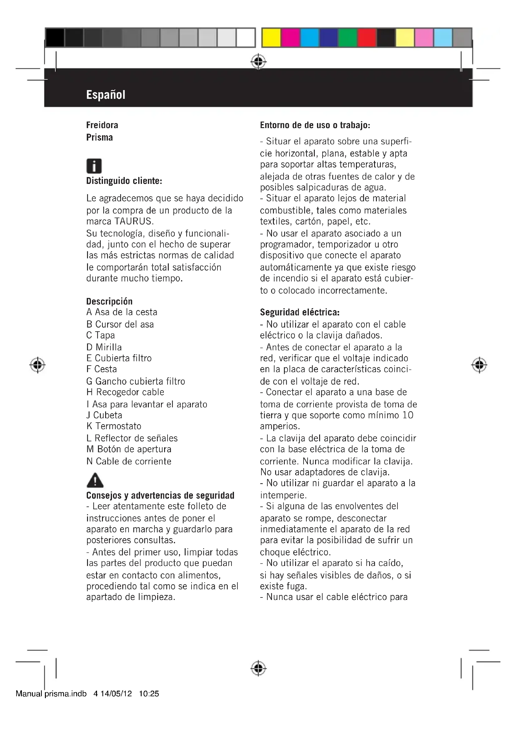 Manual prisma.indb 2 14/05/12 10:25Fig.1 Fig.3 Fig.5 Fig.2 Fig.4 Manual prisma.indb 3 14/05/12 10:25Español Freidora Prisma Distinguido cliente: Le agradecemos que se haya decidido por la compra de un producto de la marca TAURUS. Su tecnología, diseño y funcionali- dad, junto con el hecho de superar las más estrictas normas de calidad le comportarán total satisfacción durante mucho tiempo. Descripción A Asa de la cesta B Cursor del asa C Tapa D Mirilla E Cubierta filtro F Cesta G Gancho cubierta filtro H Recogedor cable I Asa para levantar el aparato J Cubeta K Termostato L Reflector de señales M Botón de apertura N Cable de corriente Consejos y advertencias de seguridad - Leer atentamente este folleto de instrucciones antes de poner el aparato en marcha y guardarlo para posteriores consultas. - Antes del primer uso, limpiar todas las partes del producto que puedan estar en contacto con alimentos, procediendo tal como se indica en el apartado de limpieza. Entorno de de uso o trabajo: - Situar el aparato sobre una superfi- cie horizontal, plana, estable y apta para soportar altas temperaturas, alejada de otras fuentes de calor y de posibles salpicaduras de agua. - Situar el aparato lejos de material combustible, tales como materiales textiles, cartón, papel, etc. - No usar el aparato asociado a un programador, temporizador u otro dispositivo que conecte el aparato automáticamente ya que existe riesgo de incendio si el aparato está cubier- to o colocado incorrectamente. Seguridad eléctrica: - No utilizar el aparato con el cable eléctrico o la clavija dañados. - Antes de conectar el aparato a la red, verificar que el voltaje indicado en la placa de características coinci- de con el voltaje de red. - Conectar el aparato a una base de toma de corriente provista de toma de tierra y que soporte como mínimo 10 amperios. - La clavija del aparato debe coincidir con la base eléctrica de la toma de corriente. Nunca modificar la clavija. No usar adaptadores de clavija. - No utilizar ni guardar el aparato a la intemperie. - Si alguna de las envolventes del aparato se rompe, desconectar inmediatamente el aparato de la red para evitar la posibilidad de sufrir un choque eléctrico. - No utilizar el aparato si ha caído, si hay señales visibles de daños, o si existe fuga. - Nunca usar el cable eléctrico para Manual prisma.indb 4 14/05/12 10:25levantar, transportar o desenchufar el aparato. - No enrollar el cable eléctrico de conexión alrededor del aparato. - No dejar que el cable eléctrico quede en contacto con las superficies calientes del aparato. - Los cables dañados o enredados au- mentan el riesgo de choque eléctrico. - No tocar la clavija de conexión con las manos mojadas. Utilización y cuidados: - Antes de cada uso, desenrollar com- pletamente el cable de alimentación del aparato. - No poner el aparato en marcha sin haber llenado antes la cubeta de aceite. - No usar el aparato si su disposi- tivo de puesta en marcha/paro no funciona. - No desplazar el aparato cuando esté funcionando o el aceite aún esté caliente. Con el aparato en frío, transportar el aparato haciendo uso de las asas. - Utilizar las asas del aparato para sostenerlo o desplazarlo. - Respetar los niveles MAX y MIN. (Fig.1) - Desenchufar el aparato de la red cuando no se use y antes de realizar cualquier operación de limpieza. - Este aparato está pensado única- mente para un uso doméstico, no para uso profesional o industrial. - Este aparato está pensado única- mente para un uso doméstico, no para uso profesional o industrial. No está pensado para ser utilizado por los huéspedes de establecimientos de alojamiento como pensiones, hoteles, moteles y otros tipos de ambientes re- sidenciales, incluyendo casas rurales o áreas de descanso para el personal de tiendas, oficinas y otros ambientes de trabajo. - No permitir que lo usen personas no familiarizadas con este tipo de producto, personas discapacitadas o niños. - Este aparato no es un juguete. Los niños deben estar bajo vigilancia para asegurar que no jueguen con el aparato. - Usar siempre el aparato bajo vigilan- cia. - Si se utiliza materia grasa en vez de aceite, se tiene que fundir ésta previamente en un recipiente aparte. - Si la materia grasa se ha endure- cido en la cubeta del aparato, hacer unos agujeros en la grasa sólida para permitir que el agua que ha podido quedar retenida en la grasa salga en forma de vapor al calentarla a tempe- ratura mínima de termostato. (Fig.2) - Si por cualquier motivo el aceite se incendiara, desconectar el aparato de la red y sofocar el fuego con la tapa, con una manta, o con un paño grande de cocina. NUNCA CON AGUA. - Toda utilización inadecuada, o en desacuerdo con las instrucciones de uso, puede comportar peligro, anulan- do la garantía y la responsabilidad del fabricante. Modo de empleo Notas previas al uso: - Antes de usar el producto por prime- Manual prisma.indb 5 14/05/12 10:25ra vez, limpie las partes en contacto con alimentos tal como se describe en el apartado de Limpieza. Llenado de aceite: - Abrir la tapa presionando el botón de apertura. - Extraer la cesta tirando de ella hacia arriba. - Verter aceite en la cubeta hasta la marca que indica el nivel MÁXIMO. - El aparato no debe funcionar con menos aceite del indicado en el nivel MÍNIMO. Uso: - Enchufar el aparato a la red eléctrica. - El piloto iluminoso se encenderá. - Seleccionar la temperatura de fritura deseada mediante el mando termostato de regulación. El indica- dor luminoso se iluminará, indicando que el aceite está en proceso de calentamiento (con la tapa cerrada se ahorra energía). - Preparar los alimentos a freír y colo- carlos en la cesta procurando que no rebasen los ¾ de su capacidad. Dejar escurrir previamente los alimen- tos antes de sumergirlos en la cubeta. - La introducción de alimentos congelados o con gran contenido en agua en la cubeta puede provocar la proyección brusca de aceite hacia el exterior a
