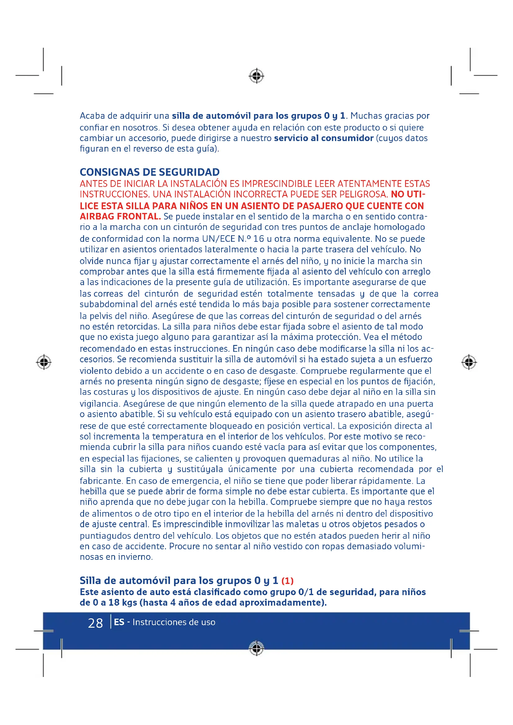 - In caso di dubbi, contattare il fabbricante del dispositivo di ritenuta o il rivenditore.28 ES - Instrucciones de uso Acaba de adquirir una silla de automóvil para los grupos 0 y 1. Muchas gracias por confiar en nosotros. Si desea obtener ayuda en relación con este producto o si quiere cambiar un accesorio, puede dirigirse a nuestro servicio al consumidor (cuyos datos figuran en el reverso de esta guía).