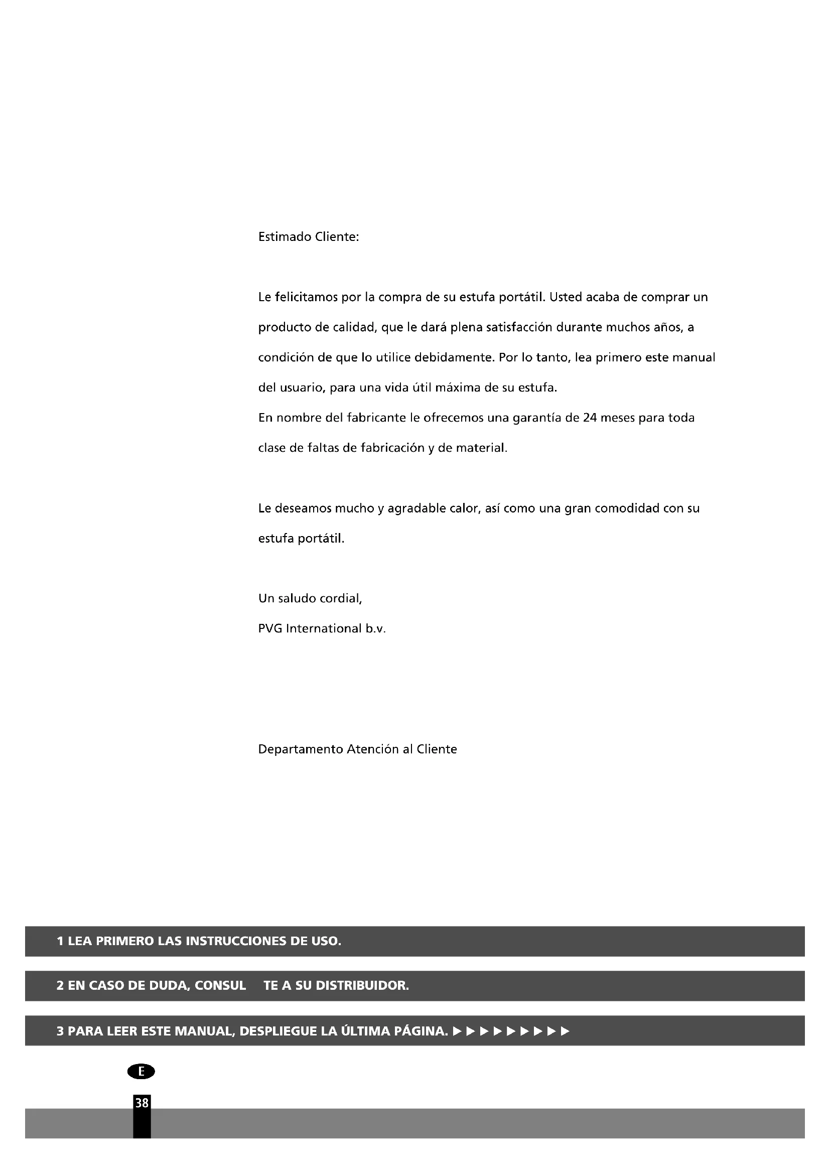 18a 18b 18dEstimado Cliente: Le felicitamos por la compra de su estufa portátil. Usted acaba de comprar un producto de calidad, que le dará plena satisfacción durante muchos años, a condición de que lo utilice debidamente. Por lo tanto, lea primero este manual del usuario, para una vida útil máxima de su estufa. En nombre del fabricante le ofrecemos una garantía de 24 meses para toda clase de faltas de fabricación y de material. Le deseamos mucho y agradable calor, así como una gran comodidad con su estufa portátil. Un saludo cordial, PVG International b.v. Departamento Atención al Cliente 1 LEA PRIMERO LAS INSTRUCCIONES DE USO.