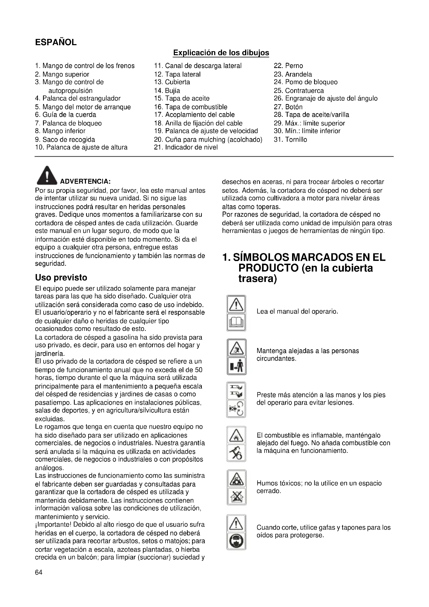 ESPAÑOL Explicación de los dibujos ADVERTENCIA: Por su propia seguridad, por favor, lea este manual antes de intentar utilizar su nueva unidad. Si no sigue las instrucciones podrá resultar en heridas personales graves. Dedique unos momentos a familiarizarse con su cortadora de césped antes de cada utilización. Guarde este manual en un lugar seguro, de modo que la información esté disponible en todo momento. Si da el equipo a cualquier otra persona, entregue estas instrucciones de funcionamiento y también las normas de seguridad. Uso previsto El equipo puede ser utilizado solamente para manejar tareas para las que ha sido diseñado. Cualquier otra utilización será considerada como caso de uso indebido. El usuario/operario y no el fabricante será el responsable de cualquier daño o heridas de cualquier tipo ocasionados como resultado de esto. La cortadora de césped a gasolina ha sido prevista para uso privado, es decir, para uso en entornos del hogar y jardinería. El uso privado de la cortadora de césped se refiere a un tiempo de funcionamiento anual que no exceda el de 50 horas, tiempo durante el que la máquina será utilizada principalmente para el mantenimiento a pequeña escala del césped de residencias y jardines de casas o como pasatiempo. Las aplicaciones en instalaciones públicas, salas de deportes, y en agricultura/silvicultura están excluidas. Le rogamos que tenga en cuenta que nuestro equipo no ha sido diseñado para ser utilizado en aplicaciones comerciales, de negocios o industriales. Nuestra garantía será anulada si la máquina es utilizada en actividades comerciales, de negocios o industriales o con propósitos análogos. Las instrucciones de funcionamiento como las suministra el fabricante deben ser guardadas y consultadas para garantizar que la cortadora de césped es utilizada y mantenida debidamente. Las instrucciones contienen información valiosa sobre las condiciones de utilización, mantenimiento y servicio. ¡Importante! Debido al alto riesgo de que el usuario sufra heridas en el cuerpo, la cortadora de césped no deberá ser utilizada para recortar arbustos, setos o matojos; para cortar vegetación a escala, azoteas plantadas, o hierba crecida en un balcón; para limpiar (succionar) suciedad y desechos en aceras, ni para trocear árboles o recortar setos. Además, la cortadora de césped no deberá ser utilizada como cultivadora a motor para nivelar áreas altas como toperas. Por razones de seguridad, la cortadora de césped no deberá ser utilizada como unidad de impulsión para otras herramientas o juegos de herramientas de ningún tipo.