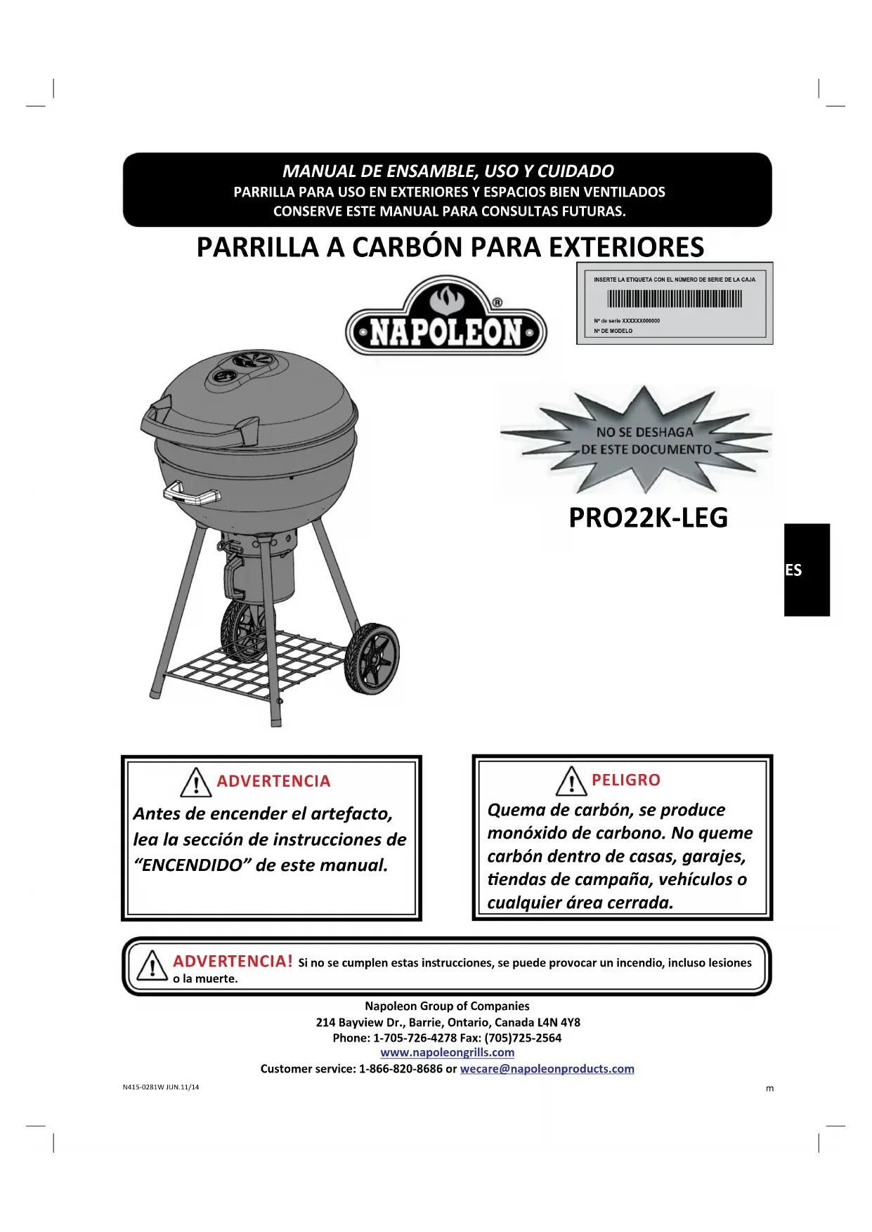 PELIGRO Quema de carbón, se produce monóxido de carbono. No queme carbón dentro de casas, garajes, endas de campaña, vehículos o cualquier área cerrada. INSERTE LA ETIQUETA CON EL NÚMERO DE SERIE DE LA CAJANº de serie XXXXXX000000Nº DE MODELO ADVERTENCIA Antes de encender el artefacto, lea la sección de instrucciones de “ENCENDIDO” de este manual. PRO22K-LEG