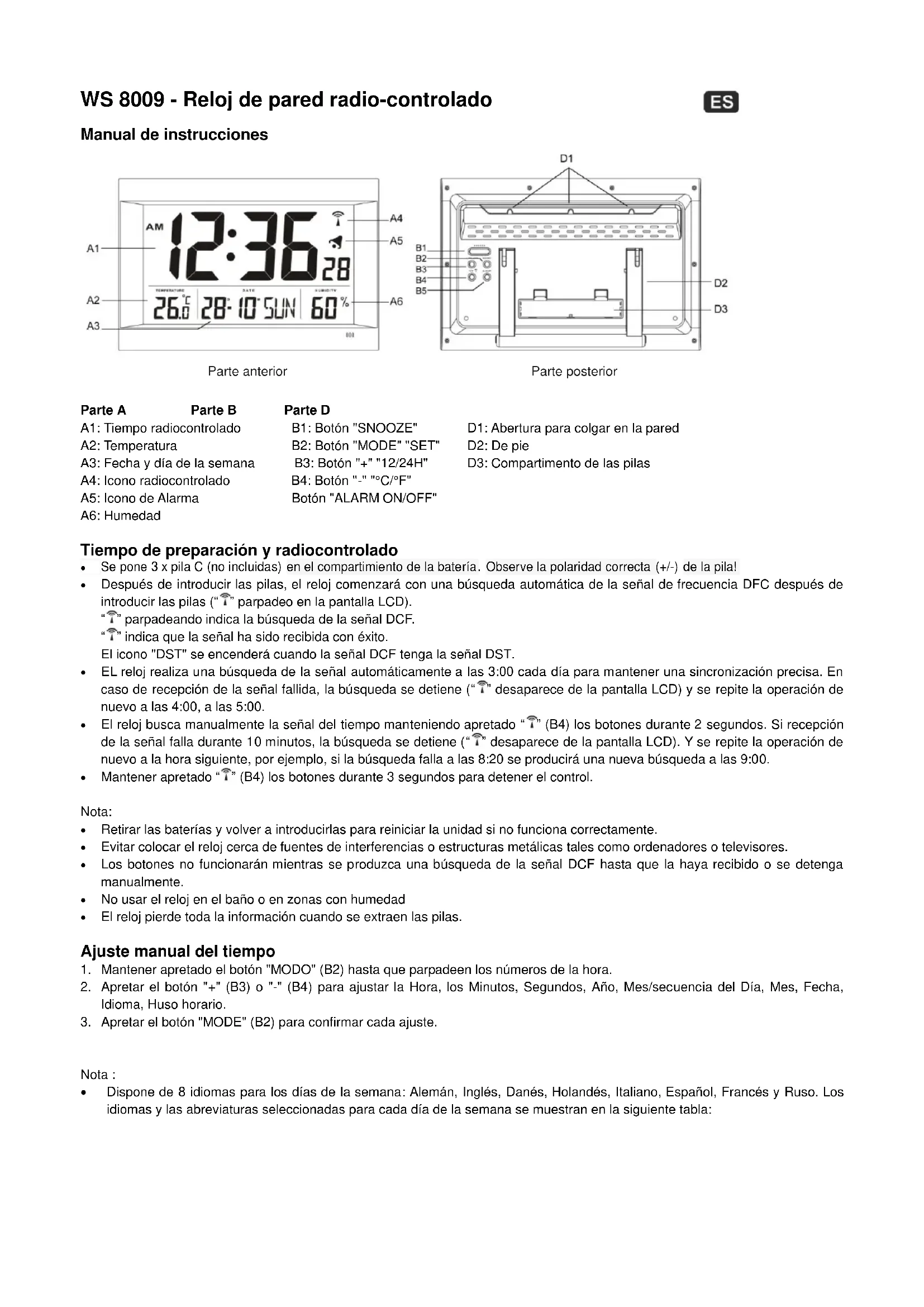 Parte A Parte B Parte D A1: Tiempo radiocontrolado B1: Botón "SNOOZE" D1: Abertura para colgar en la pared A2: Temperatura B2: Botón "MODE" "SET" D2: De pie A3: Fecha y día de la semana B3: Botón "+" "12/24H" D3: Compartimento de las pilas A4: Icono radiocontrolado B4: Botón "-" "°C/°F" A5: Icono de Alarma Botón "ALARM ON/OFF" A6: Humedad Tiempo de preparación y radiocontrolado