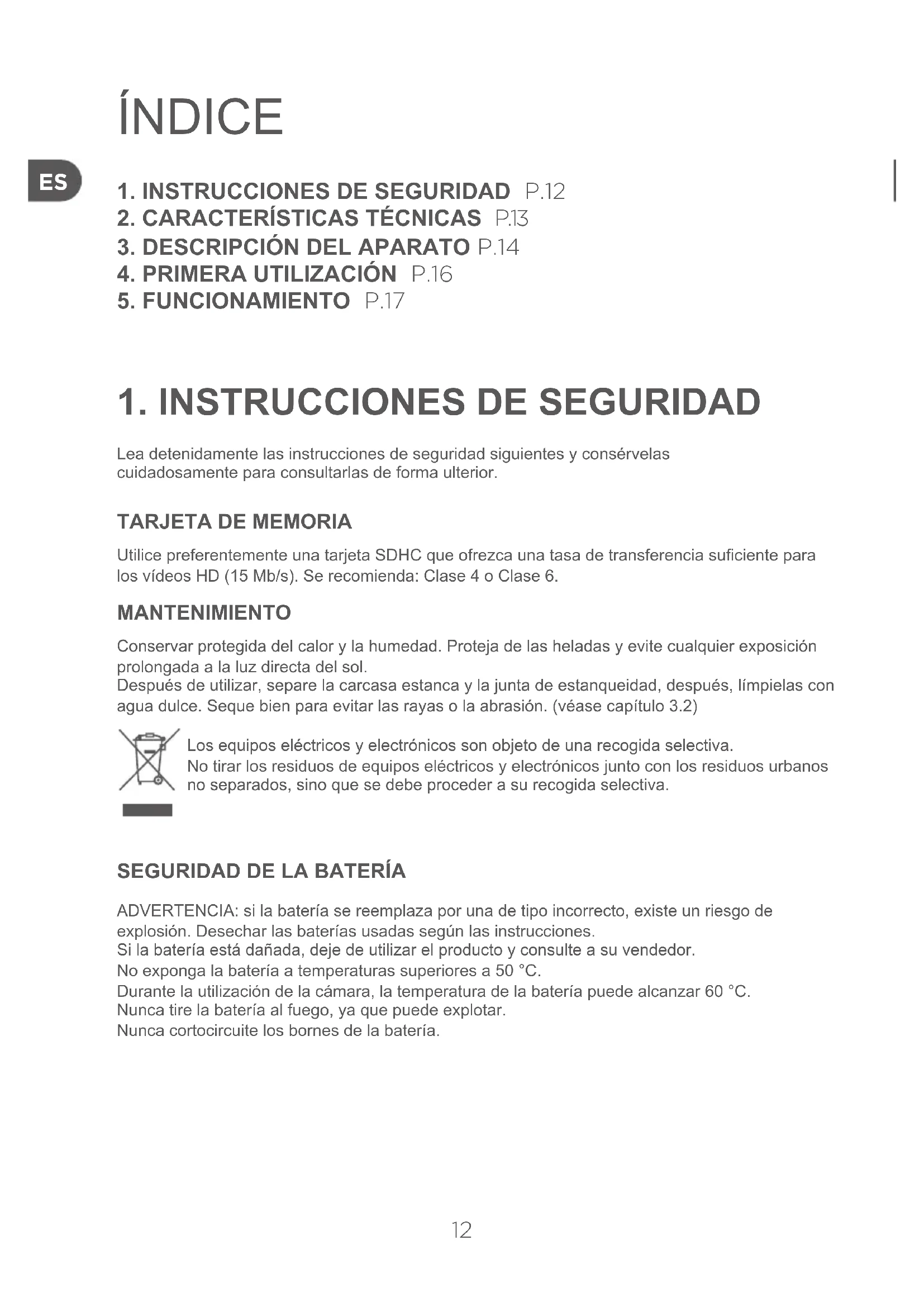 Utilice preferentemente una tarjeta SDHC que ofrezca una tasa de transferencia suciente para los vídeos HD (15 Mb/s). Se recomienda: Clase 4 o Clase 6. MANTENIMIENTO Conservar protegida del calor y la humedad. Proteja de las heladas y evite cualquier exposición prolongada a la luz directa del sol. Después de utilizar, separe la carcasa estanca y la junta de estanqueidad, después, límpielas con agua dulce. Seque bien para evitar las rayas o la abrasión. (véase capítulo 3.2)Los equipos eléctricos y electrónicos son objeto de una recogida selectiva. No tirar los residuos de equipos eléctricos y electrónicos junto con los residuos urbanos no separados, sino que se debe proceder a su recogida selectiva.
