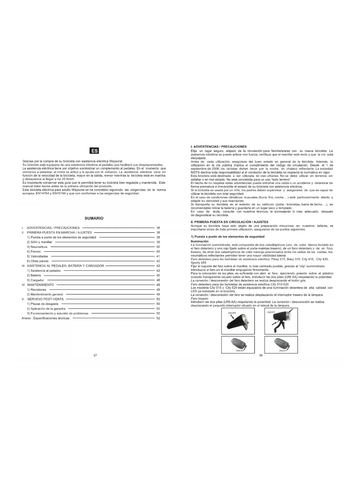 Anexo : Especificaciones técnicas Gracias por la compra de su bicicleta con asistencia eléctrica Wayscral. Su bicicleta está equipada de una asistencia eléctrica al pedaleo que facilitará sus desplazamientos. La asistencia eléctrica tiene por objetivo suministrar un complemento al pedaleo. En el momento que comience a pedalear, el motor se activa y le ayuda con el esfuerzo. La asistencia eléctrica varia en función de la velocidad de la bicicleta, mayor en la salida, menor mientras la bicicleta está en marcha y desaparece al llegar a los 25 Km/h. Es importante conservar esta guía que le permitirá tener su bicicleta bien regulada y mantenida . Este manual debe leerse antes de la primera utilización del producto. Esta bicicleta eléctrica para adulto Wayscral se ha concebido siguiendo las exigencias de la norma europea: EN14764 y EN15194 y que son conformes a las exigencias de seguridad.