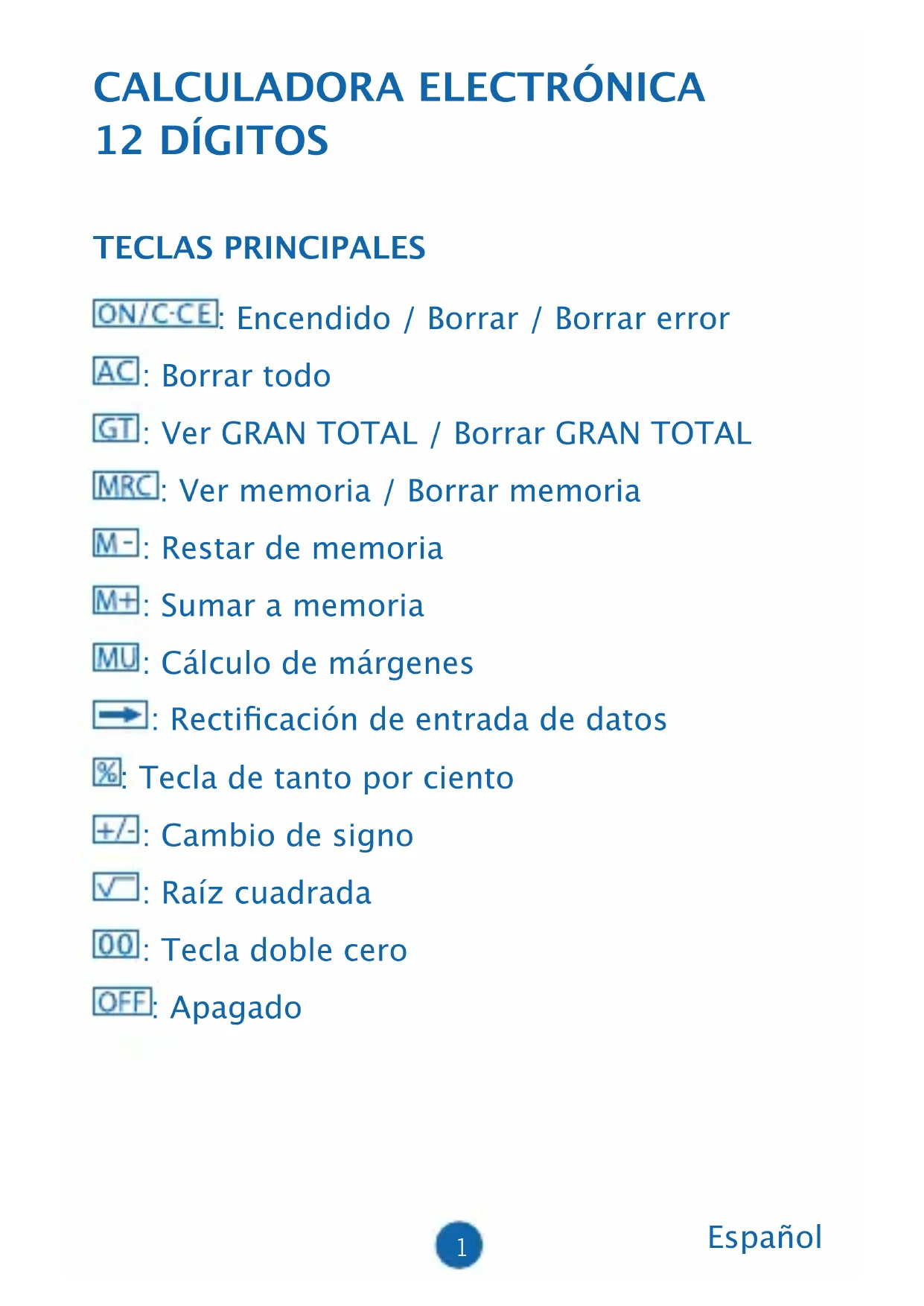 12 DÍGITOS TECLAS PRINCIPALES : Encendido / Borrar / Borrar error : Borrar todo : Ver GRAN TOTAL / Borrar GRAN TOTAL : Ver memoria / Borrar memoria : Restar de memoria : Sumar a memoria : Cálculo de márgenes : Recticación de entrada de datos : Tecla de tanto por ciento : Cambio de signo : Raíz cuadrada : Tecla doble cero : Apagado Español2 DESCRIPCIÓN DE LOS SELECTORES: