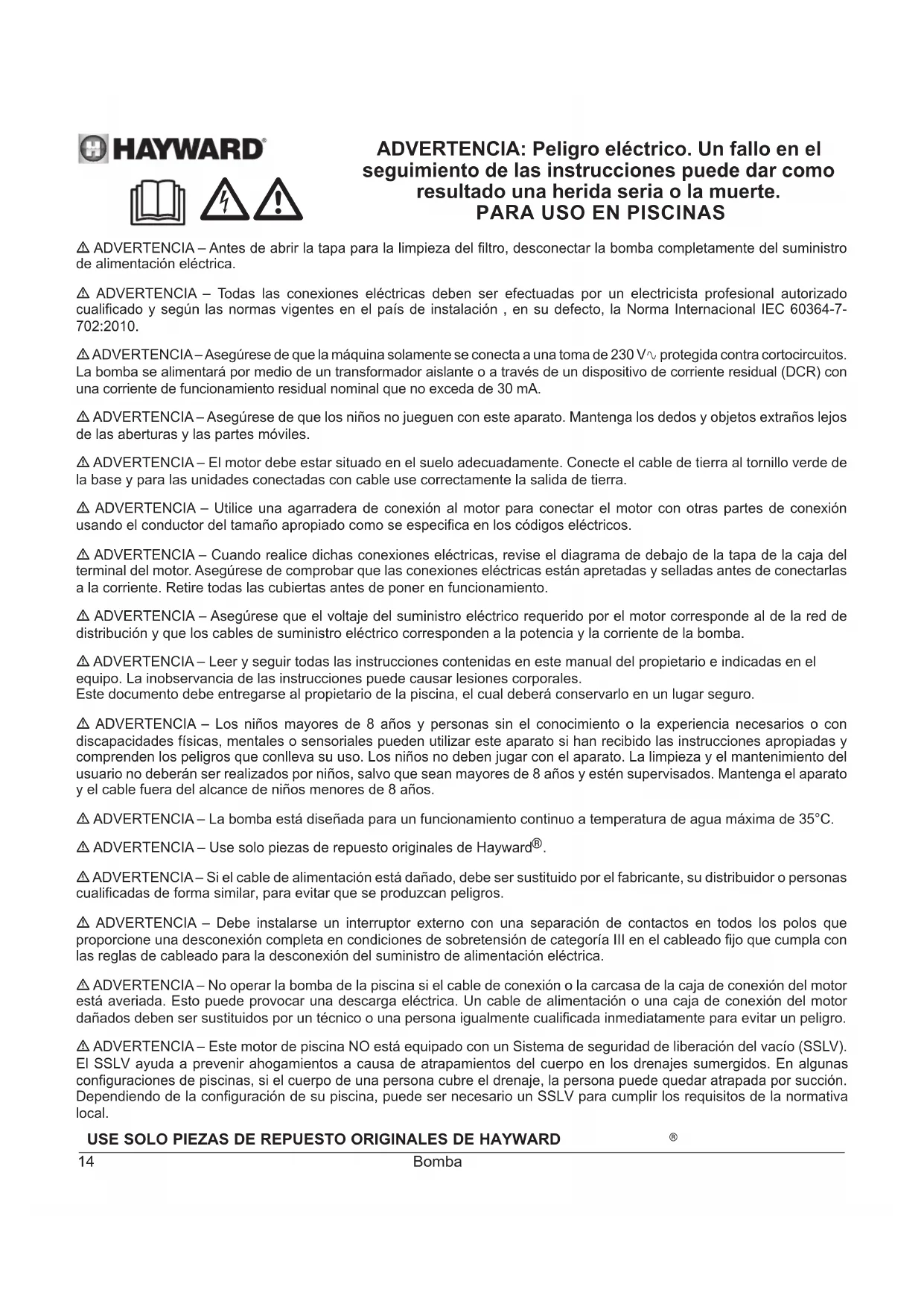 - ADVERTENCIA – Use solo piezas de repuesto originales de Hayward