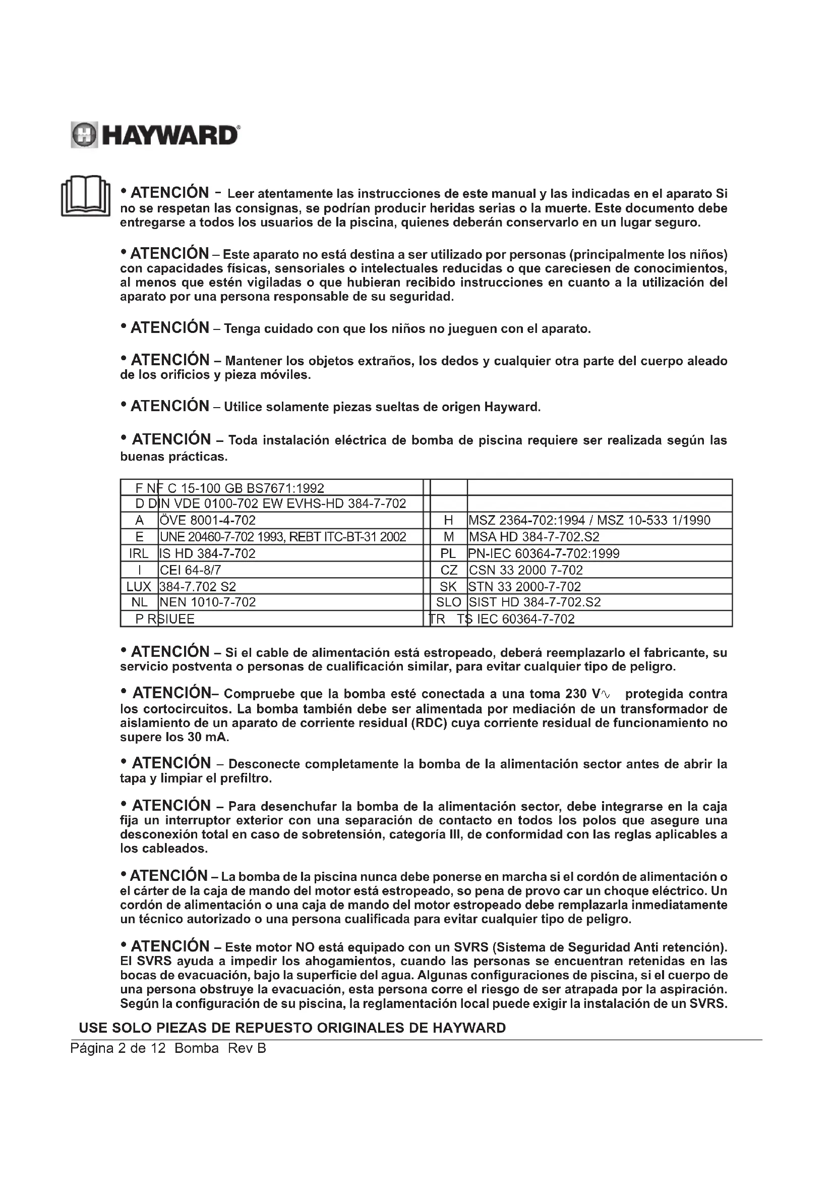 - ATENCIÓN – Este motor NO está equipado con un SVRS (Sistema de Seguridad Anti retención). El SVRS ayuda a impedir los ahogamientos, cuando las personas se encuentran retenidas en las bocas de evacuación, bajo la superficie del agua. Algunas configuraciones de piscina, si el cuerpo de una persona obstruye la evacuación, esta persona corre el riesgo de ser atrapada por la aspiración. Según la configuración de su piscina, la reglamentación local puede exigir la instalación de un SVRS.USE SOLO PIEZAS DE REPUESTO ORIGINALES DE HAYWARD Página 3 de 12 Bomba Rev B GENERALIDADES Le felicitamos por haber adquirido una bomba de velocidad varibale Hayward