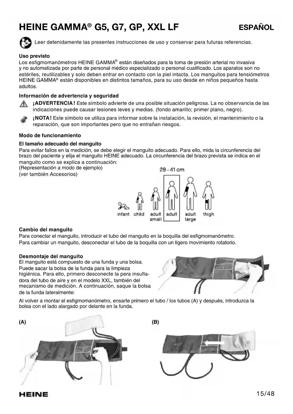 Los esfigmomanómetros HEINE GAMMA® está disnado para la toma de presion arterial no invasiva y no automatizada por parte de personal medico especializo o personalrial significado. Los aparatos son no esteriles, reutilizables y solo deben estar en contacto con la piel intacta. Los manguitos para tensiometros HEINE GAMMA® está disponibles en distinctos tamaños, para su uso desde en niños微量元素 hasta增值.