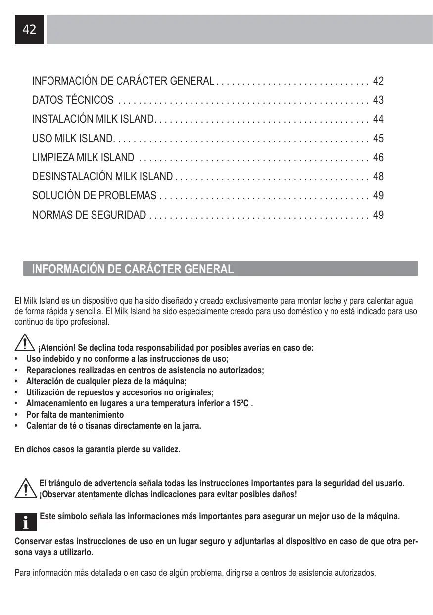 ATENCLON! antes de usar el Milk Island es besoino limpiar la jarra y los demas componentes. Comprobar que todos los componentes se hayan instalado correctamente. El cristal de la jarra sueque alcanzar temperaturas elevadas: Riesgo de quemaduras! Usar el Milk Island solo para agua y leche. Este prohibido uso lo con otheros liquidos de naturaleza o composicion quimica diferente.