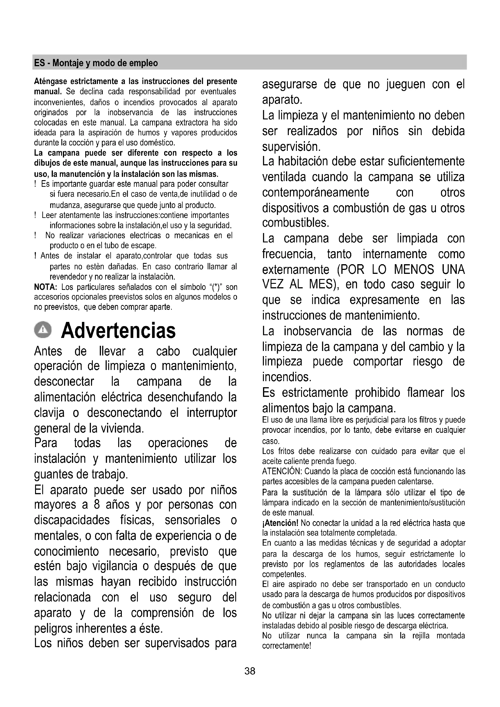 Als de verlichting niet werkt, controleer dan of de lampjes goed op hun plaats zitten alvorens de assistentiedienst te bellen.38 ES - Montaje y modo de empleo Aténgase estrictamente a las instrucciones del presente manual. Se declina cada responsabilidad por eventuales inconvenientes, daños o incendios provocados al aparato originados por la inobservancia de las instrucciones colocadas en este manual. La campana extractora ha sido ideada para la aspiración de humos y vapores producidos durante la cocción y para el uso doméstico. La campana puede ser diferente con respecto a los dibujos de este manual, aunque las instrucciones para su uso, la manutención y la instalación son las mismas. ! Es importante guardar este manual para poder consultar si fuera necesario.En el caso de venta,de inutilidad o de mudanza, asegurarse que quede junto al producto. ! Leer atentamente las instrucciones:contiene importantes informaciones sobre la instalación,el uso y la seguridad. ! No realizar variaciones electricas o mecanicas en el producto o en el tubo de escape. ! Antes de instalar el aparato,controlar que todas sus partes no estèn dañadas. En caso contrario llamar al revendedor y no realizar la instalaciòn. NOTA: Los particulares señalados con el símbolo “(*)” son accesorios opcionales preevistos solos en algunos modelos o no preevistos, que deben comprar aparte. Advertencias Antes de llevar a cabo cualquier operación de limpieza o mantenimiento, desconectar la campana de la alimentación eléctrica desenchufando la clavija o desconectando el interruptor general de la vivienda. Para todas las operaciones de instalación y mantenimiento utilizar los guantes de trabajo. El aparato puede ser usado por niños mayores a 8 años y por personas con discapacidades físicas, sensoriales o mentales, o con falta de experiencia o de conocimiento necesario, previsto que estén bajo vigilancia o después de que las mismas hayan recibido instrucción relacionada con el uso seguro del aparato y de la comprensión de los peligros inherentes a éste. Los niños deben ser supervisados para asegurarse de que no jueguen con el aparato. La limpieza y el mantenimiento no deben ser realizados por niños sin debida supervisión. La habitación debe estar suficientemente ventilada cuando la campana se utiliza contemporáneamente con otros dispositivos a combustión de gas u otros combustibles. La campana debe ser limpiada con frecuencia, tanto internamente como externamente (POR LO MENOS UNA VEZ AL MES), en todo caso seguir lo que se indica expresamente en las instrucciones de mantenimiento. La inobservancia de las normas de limpieza de la campana y del cambio y la limpieza puede comportar riesgo de incendios. Es estrictamente prohibido flamear los alimentos bajo la campana. El uso de una llama libre es perjudicial para los filtros y puede provocar incendios, por lo tanto, debe evitarse en cualquier caso. Los fritos debe realizarse con cuidado para evitar que el aceite caliente prenda fuego. ATENCIÓN: Cuando la placa de cocción está funcionando las partes accesibles de la campana pueden calentarse. Para la sustitución de la lámpara sólo utilizar el tipo de lámpara indicado en la sección de mantenimiento/sustitución de este manual. ¡Atención! No conectar la unidad a la red eléctrica hasta que la instalación sea totalmente completada. En cuanto a las medidas técnicas y de seguridad a adoptar para la descarga de los humos, seguir estrictamente lo previsto por los reglamentos de las autoridades locales competentes. El aire aspirado no debe ser transportado en un conducto usado para la descarga de humos producidos por dispositivos de combustión a gas u otros combustibles. No utilizar ni dejar la campana sin las luces correctamente instaladas debido al posible riesgo de descarga eléctrica. No utilizar nunca la campana sin la rejilla montada correctamente!39 La campana NUNCA debe utilizarse como una superficie de apoyo a menos que así se indique específicamente. Utilizar sólo los tornillos para fijación suministrados con el producto para su instalación, o, si no se suministran, comprar el tipo correcto de tornillos. Utilizar la longitud correcta para los tornillos que se identifican en la Guía de instalación. En caso de duda, consultar el centro de asistencia autorizado o un similar personal calificado. ¡ATENCIÓN! Si no se instalan los tornillos y elementos de fijación de acuerdo con estas instrucciones se puede incurrir en riesgos de naturaleza eléctricos. Este aparato lleva el marcado CE en conformidad con la Directiva 2012/19/EC del Parlamento Europeo y del Consejo sobre residuos de aparatos eléctricos y electrónicos (RAEE). La correcta eliminación de este producto evita consecuencias negativas para el medioambiente y la salud. El símbolo en el producto o en los documentos que se incluyen con el producto, indica que no se puede tratar como residuo doméstico. Es necesario entregarlo en un punto de recogida para reciclar aparatos eléctricos y electrónicos. Deséchelo con arreglo a las normas medioambientales para eliminación de residuos. Para obtener información más detallada sobre el tratamiento, recuperación y reciclaje de este producto, póngase en contacto con su Municipalidad, con el servicio de eliminación de residuos urbanos o la tienda donde adquirió el producto. Aparato diseñado, probado y fabricado de acuerdo con: