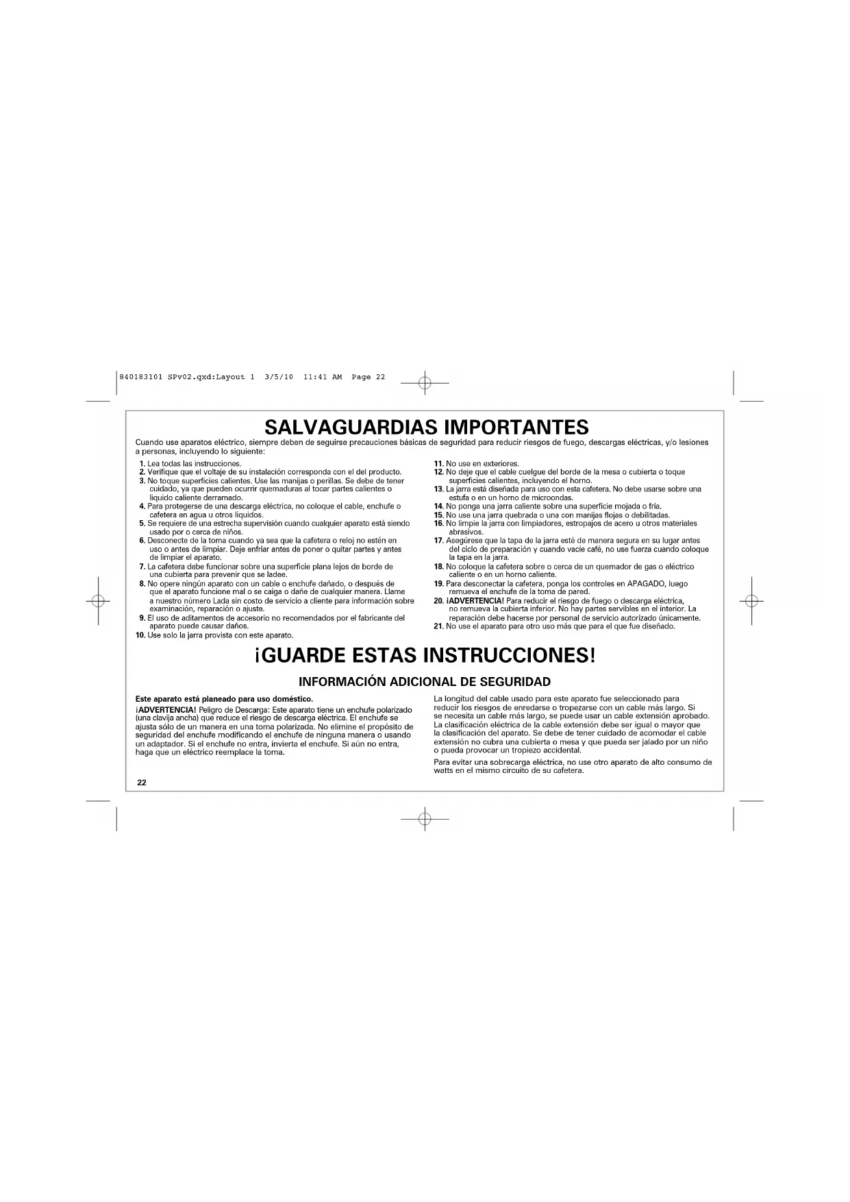 EXCEPCIONES Esta garantía no será efectiva en los siguientes casos: a) Cuando el producto se hubiese utlizado en condiciones distintas a las normales. (Uso industrial, semi-industrial o comercial.) b) Cuando el producto no hubiese sido operado de acuerdo con el instructivo de uso. c) Cuando el producto hubiese sido alterado o reparado por personas no autorizadas por Grupo HB PS, S.A. de C.V. el fabricante nacional, importador o comercializador responsable respectivo. El consumidor puede solicitar que se haga efectiva la garantía ante la propia casa comercial donde adquirió su producto, siempre y cuando Grupo HB PS, S.A. de C.V. no cuente con talleres de servicio. 840183101 SPv02.qxd:Layout 1 3/5/10 11:41 AM Page 313/10
