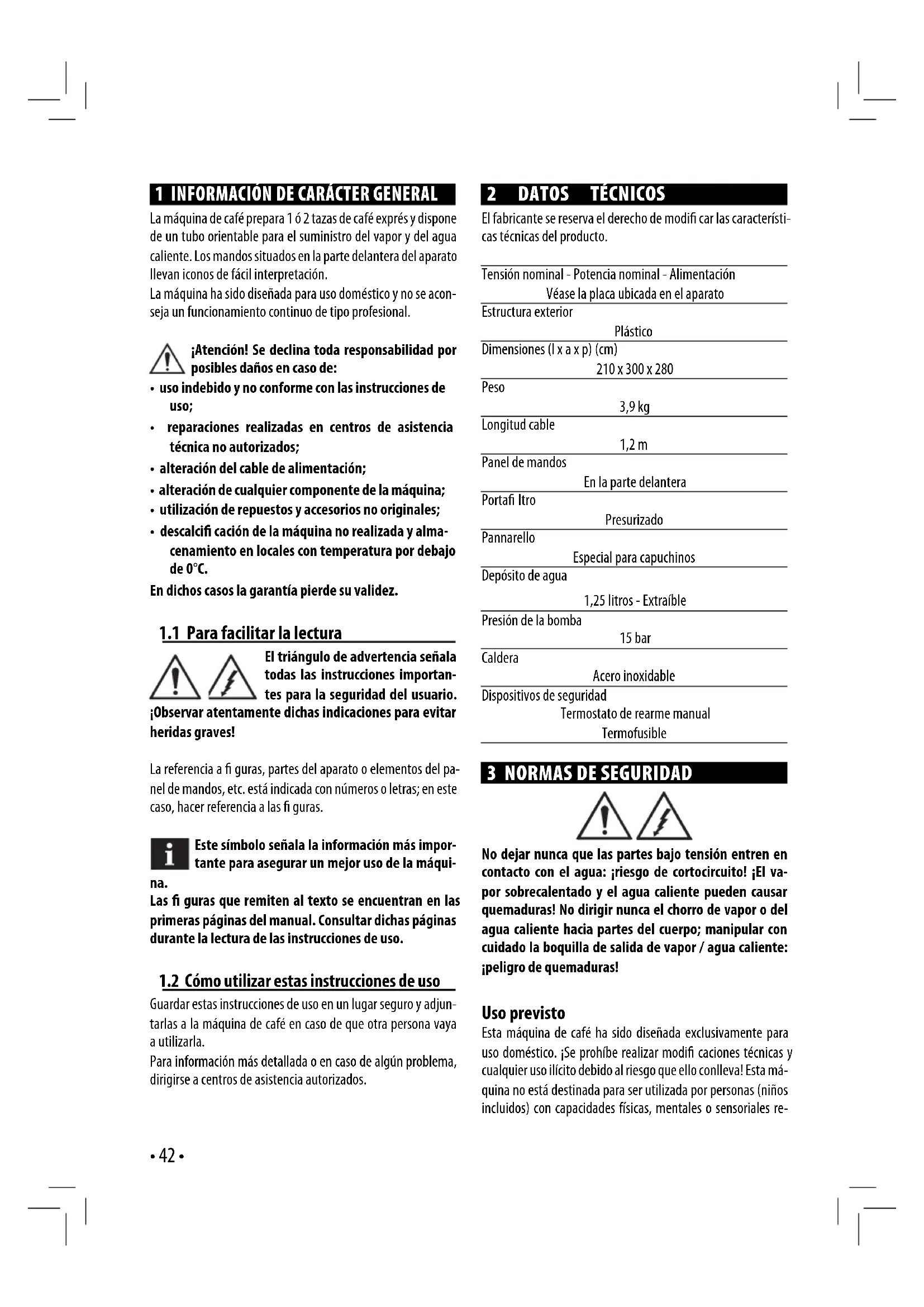 El fabricante se reserva el derecho de modi car las característi- cas técnicas del producto. Tensión nominal - Potencia nominal - Alimentación Véase la placa ubicada en el aparato Estructura exterior Plástico Dimensiones (l x a x p) (cm) 210 x 300 x 280 Peso 3,9 kg Longitud cable 1,2 m Panel de mandos En la parte delantera Porta ltro Presurizado Pannarello Especial para capuchinos Depósito de agua 1,25 litros - Extraíble Presión de la bomba 15 bar Caldera Acero inoxidable Dispositivos de seguridad Termostato de rearme manual Termofusible