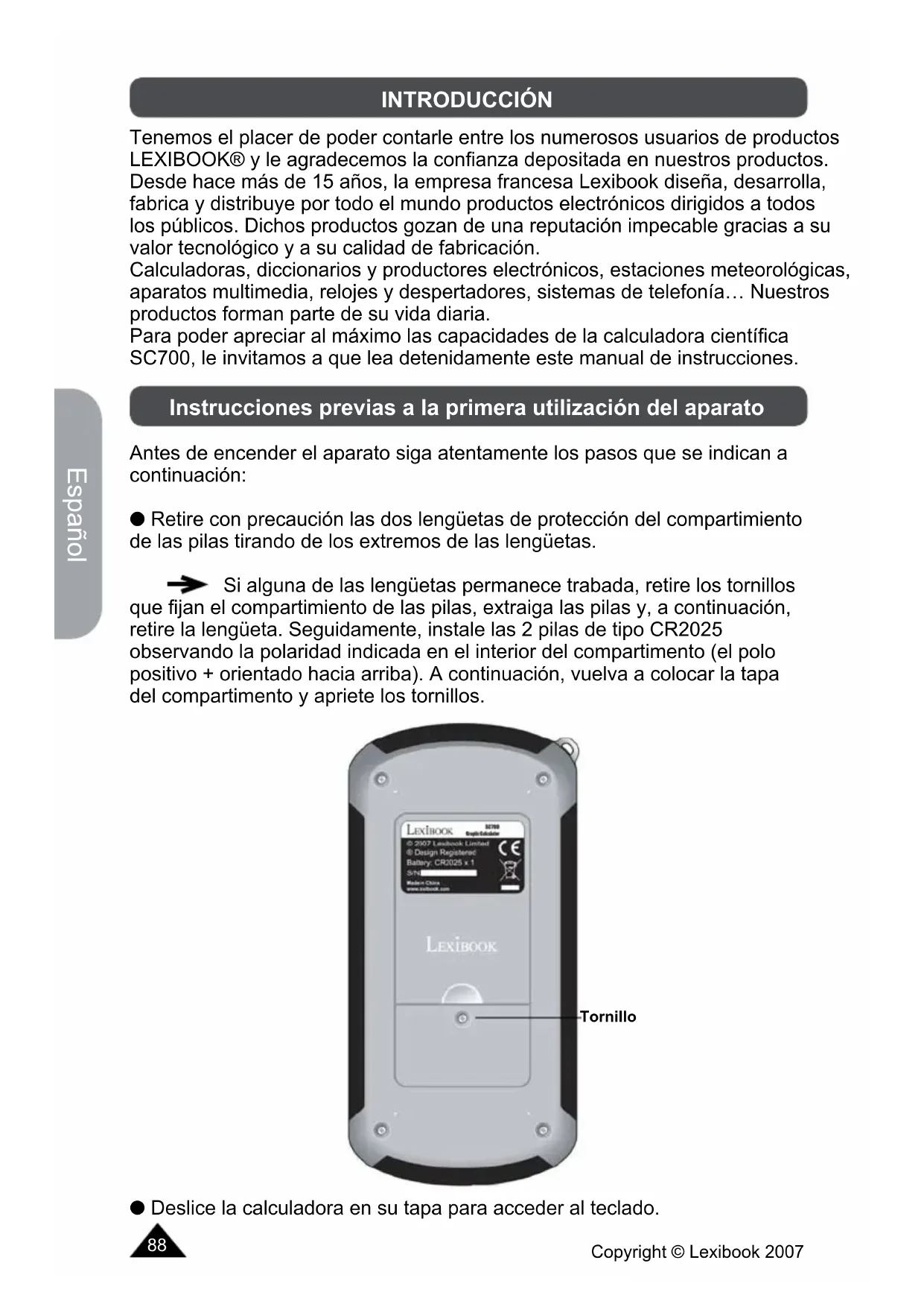 13. GARANTÍA ......................................................................................................... 16588 Español Copyright © Lexibook 2007 Tenemos el placer de poder contarle entre los numerosos usuarios de productos LEXIBOOK® y le agradecemos la conanza depositada en nuestros productos. Desde hace más de 15 años, la empresa francesa Lexibook diseña, desarrolla, fabrica y distribuye por todo el mundo productos electrónicos dirigidos a todos los públicos. Dichos productos gozan de una reputación impecable gracias a su valor tecnológico y a su calidad de fabricación. Calculadoras, diccionarios y productores electrónicos, estaciones meteorológicas, aparatos multimedia, relojes y despertadores, sistemas de telefonía… Nuestros productos forman parte de su vida diaria. Para poder apreciar al máximo las capacidades de la calculadora cientíca SC700, le invitamos a que lea detenidamente este manual de instrucciones. INTRODUCCIÓN Instrucciones previas a la primera utilización del aparato Antes de encender el aparato siga atentamente los pasos que se indican a continuación: l Retire con precaución las dos lengüetas de protección del compartimiento de las pilas tirando de los extremos de las lengüetas. Si alguna de las lengüetas permanece trabada, retire los tornillos que jan el compartimiento de las pilas, extraiga las pilas y, a continuación, retire la lengüeta. Seguidamente, instale las 2 pilas de tipo CR2025 observando la polaridad indicada en el interior del compartimento (el polo positivo + orientado hacia arriba). A continuación, vuelva a colocar la tapa del compartimento y apriete los tornillos. l Deslice la calculadora en su tapa para acceder al teclado. Tornillo89 Español Copyright © Lexibook 2007