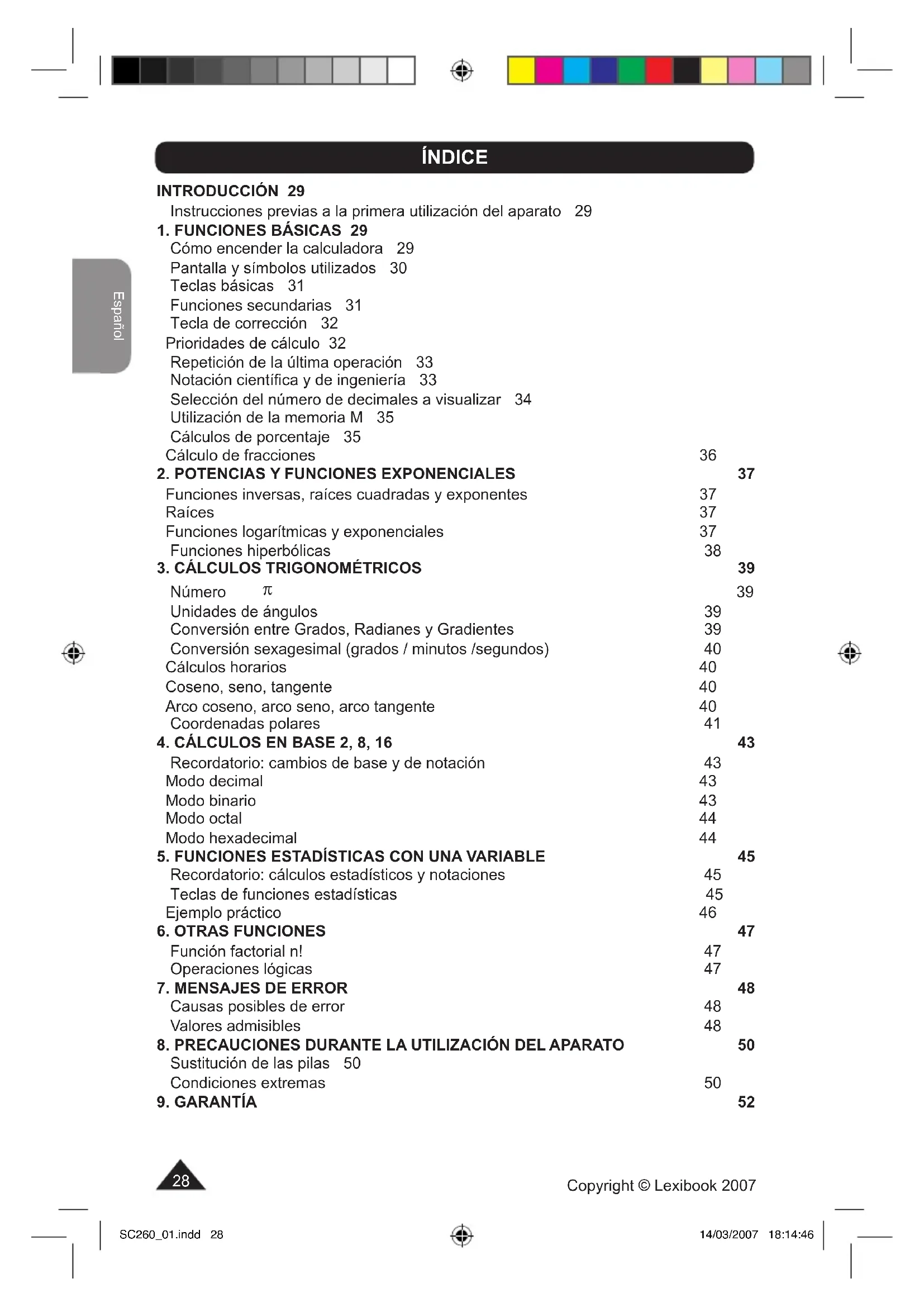 SC260_01.indd 28 14/03/2007 18:14:4629 Copyright © Lexibook 2007 Tenemos el placer de poder contarle entre los numerosos usuarios de productosLEXIBOOK®yleagradecemoslaconanzadepositadaen nuestrosproductos. Desdehacemásde15años,laempresafrancesaLexibookdiseña, desarrolla,fabricaydistribuyeportodoelmundoproductoselectrónicos dirigidosatodoslospúblicos.Dichosproductosgozandeunareputación impecablegraciasasuvalortecnológicoyasucalidaddefabricación. Calculadoras,diccionariosyproductoreselectrónicos,estaciones meteorológicas,aparatosmultimedia,relojesydespertadores,sistemasde telefonía…Nuestrosproductosformanpartedesuvidadiaria. Parapoderapreciaralmáximolascapacidadesdelacalculadoracientíca SC260,leinvitamosaqueleadetenidamenteestemanualdeinstrucciones. INTRODUCCIÓN Instrucciones previas a la primera utilización del aparato Antesdeencenderelaparatosigaatentamentelospasosqueseindicana continuación: 1-Retirelapelículaestáticaqueprotegelapantalla. 2-InsertelapiladetipoAG10queseincluyeconestacalculadora.Para ello, utilice un destornillador para retirar la tapa del compartimento de la pila situadoenlapartetraseradelaparato.Instalelapilaobservandola polaridadindicadaenelinteriordelcompartimento(elpolopositivo+ orientadohaciaarriba).Vuelvaacolocarlatapa. Sideseaobtenermásinformaciónacercadelapila,consulteelcapítulo “Sustitucióndelaspilas”. 3-Pulselatecla[C/CE]y,acontinuación,[AC]paraencenderla calculadora.Sisehainstaladocorrectamentelapila,eliconoDEGyel número0apareceránenlapantalla.Encasocontrario,retirelapilayvuelva ainstalarlacorrectamente. D EG