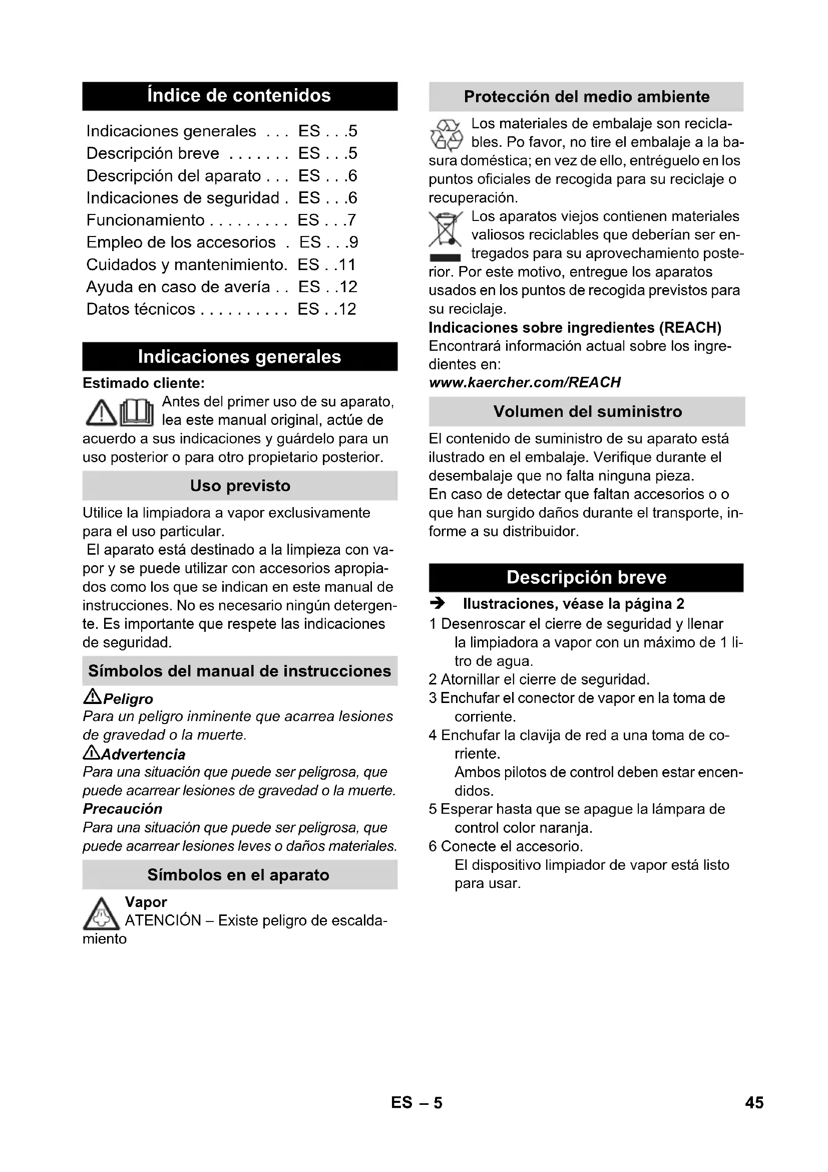 - Veiligheidsklasse IP X4 Beschermingsklasse I Capaciteit Verwarmingscapaciteit 1500 W Verwarmingscapaciteit Strijkijzer 750 W Maximale bedrijfsdruk 0,32 MPa Opwarmtijd 8 Minuten Maximale hoeveelheid stoom 40 g/min. Afmetingen Stoomreservoir 1,0 l Lengte 380 mm Breedte 254 mm Hoogte 260 mm Gewicht (excl. accessoires) 2,9 kg 44 NL– 5 Estimado cliente: Antes del primer uso de su aparato, lea este manual original, actúe de acuerdo a sus indicaciones y guárdelo para un uso posterior o para otro propietario posterior. Utilice la limpiadora a vapor exclusivamente para el uso particular. El aparato está destinado a la limpieza con va- por y se puede utilizar con accesorios apropia- dos como los que se indican en este manual de instrucciones. No es necesario ningún detergen- te. Es importante que respete las indicaciones de seguridad. Peligro Para un peligro inminente que acarrea lesiones de gravedad o la muerte. 몇 Advertencia Para una situación que puede ser peligrosa, que puede acarrear lesiones de gravedad o la muerte. Precaución Para una situación que puede ser peligrosa, que puede acarrear lesiones leves o daños materiales. Vapor ATENCIÓN – Existe peligro de escalda- miento Los materiales de embalaje son recicla- bles. Po favor, no tire el embalaje a la ba- sura doméstica; en vez de ello, entréguelo en los puntos oficiales de recogida para su reciclaje o recuperación. Los aparatos viejos contienen materiales valiosos reciclables que deberían ser en- tregados para su aprovechamiento poste- rior. Por este motivo, entregue los aparatos usados en los puntos de recogida previstos para su reciclaje. Indicaciones sobre ingredientes (REACH) Encontrará información actual sobre los ingre- dientes en: www.kaercher.com/REACH El contenido de suministro de su aparato está ilustrado en el embalaje. Verifique durante el desembalaje que no falta ninguna pieza. En caso de detectar que faltan accesorios o o que han surgido daños durante el transporte, in- forme a su distribuidor. Ilustraciones, véase la página 2 1 Desenroscar el cierre de seguridad y llenar la limpiadora a vapor con un máximo de 1 li- tro de agua. 2 Atornillar el cierre de seguridad. 3 Enchufar el conector de vapor en la toma de corriente. 4 Enchufar la clavija de red a una toma de co- rriente. Ambos pilotos de control deben estar encen- didos. 5 Esperar hasta que se apague la lámpara de control color naranja. 6 Conecte el accesorio. El dispositivo limpiador de vapor está listo para usar. Índice de contenidos Indicaciones generales