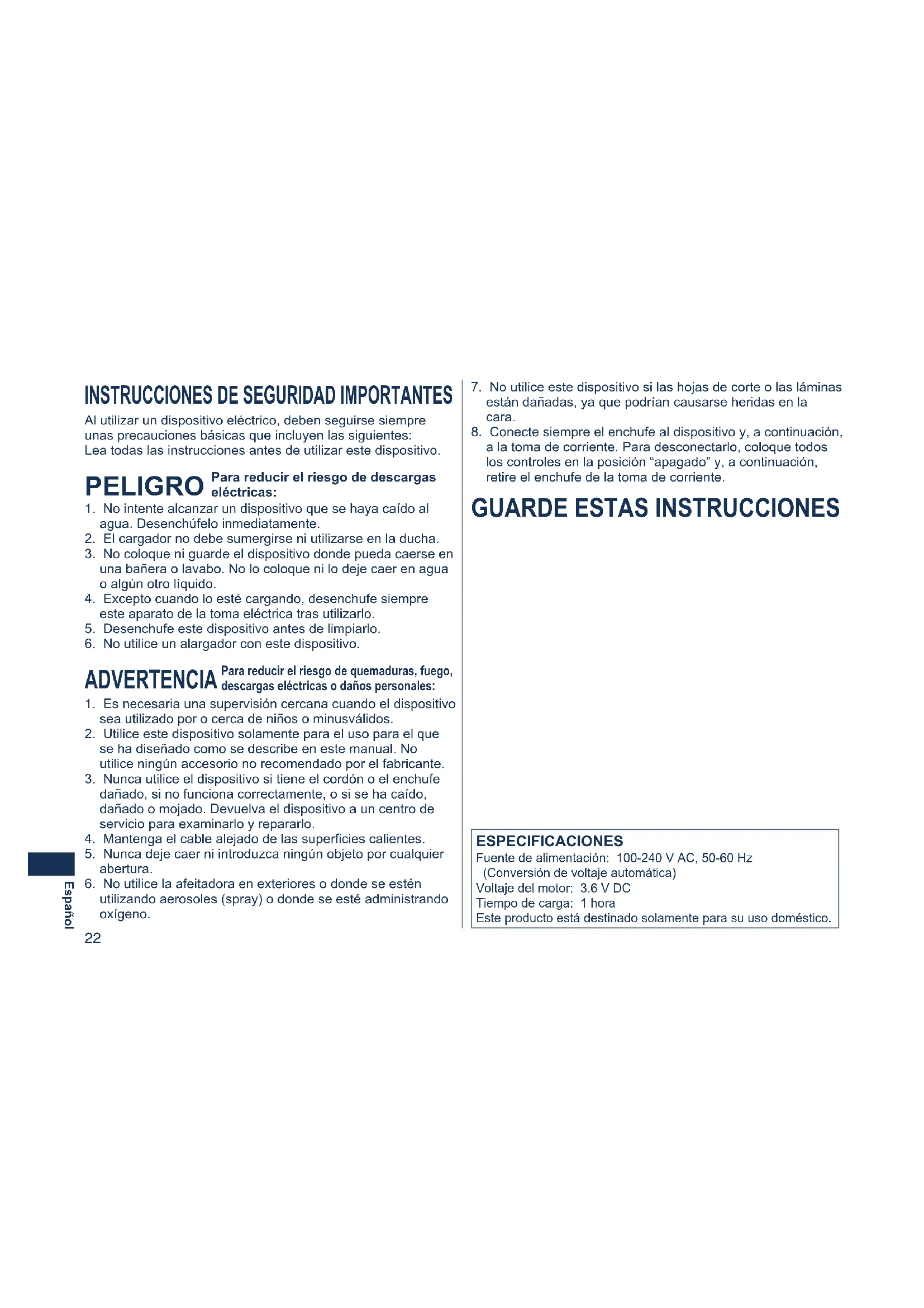 a la toma de corriente. Para desconectarlo, coloque todos los controles en la posición “apagado” y, a continuación, retire el enchufe de la toma de corriente. ESPECIFICACIONES Fuente de alimentación: 100-240 V AC, 50-60 Hz (Conversión de voltaje automática) Voltaje del motor: 3.6 V DC Tiempo de carga: 1 hora Este producto está destinado solamente para su uso doméstico. ES8228_USA.indb 22 2006/08/21 15:51:5623 Español Importante Antes de utilizarlo Esta afeitadora en Mojado/Seco puede utilizarse para afeitado en mojado con espuma o para afeitado en seco. Puede utilizar esta afeitadora impermeable bajo la ducha y limpiarla con agua. El siguiente es el símbolo de la afeitadora en mojado. El símbolo indica que el dispositivo manual puede utilizarse en un baño o ducha. Cuídese con afeitados de espuma tres semanas y observe la diferencia. Su afeitadora Panasonic en Mojado/Seco requiere algo de tiempo para ajustarse debido a que su piel y barba necesitan alrededor de un mes para acostumbrarse a cualquier nuevo método de afeitado. Utilización de la afeitadora Precaución - La lámina exterior es muy fina y puede dañarse si no se utiliza correctamente. Compruebe que la lámina no esté dañada antes de utilizar la afeitadora. No utilice la afeitadora si la lámina o algún otro elemento está dañado, ya que podría cortarse la piel. Carga de la afeitadora Para cargar la afeitadora utilice solamente el cable y el cargador proporcionados. Enchufe el adaptador en una toma de corriente doméstica donde no haya humedad y manéjela con las manos secas. La afeitadora y el cargador podrían calentarse durante la utilización y la carga. Sin embargo, esto no supone una avería. No cargue la afeitadora en un lugar donde pueda estar expuesta a la luz solar directa o a otras fuentes de calor. Sujete el adaptador al desconectarlo de la toma de corriente. Si tira del cable de alimentación, podría dañarlo. Póngase en contacto con un centro de servicio autorizado si el cable de alimentación resulta dañado. El adaptador está preparado para orientarlo correctamente en una posición vertical o en el suelo. Limpieza de la afeitadora Desconecte el cable de alimentación de la afeitadora antes de limpiarla para evitar descargas eléctricas. Mantenga insertadas ambas láminas interiores. Si solamente está insertada una lámina, la afeitadora podría dañarse. Si limpia la afeitadora con agua, no utilice agua salada ni agua caliente. No moje la afeitadora con agua durante un largo periodo de tiempo. Frótela con un paño humedecido en agua jabonosa. No utilice disolventes, bencina ni alcohol. Guardado de la afeitadora Desconecte el cable de alimentación al guardar la afeitadora. No doble el cable de alimentación ni lo enrolle alrededor de la afeitadora. No deje la afeitadora al alcance de niños pequeños. Guarde estas instrucciones de funcionamiento en un lugar seguro. Recargador de limpieza automática No limpie el adaptador ni el recargador de limpieza automática con agua, ya que los dañaría o causaría descargas eléctricas. No retire la afeitadora del recargador de limpieza automática mientras utiliza un programa que incluya la función “Secar”. El programa utiliza un calentador por lo que el área de las cuchillas se encontrará extremadamente caliente y podría quemarse. Coloque el recargador de limpieza automática en una superficie nivelada y estable. En caso contrario el líquido de limpieza podría salpicar y deteriorar el color de productos de cuero u otras superficies. Límpielo inmediatamente. El recargador de limpieza automática limpia las cuchillas interiores y la lámina exterior del sistema. Limpie con agua las demás áreas para eliminar los recortes de barba. ES8228_USA.indb 23 2006/08/21 15:51:5624 Español Identificación de las partes