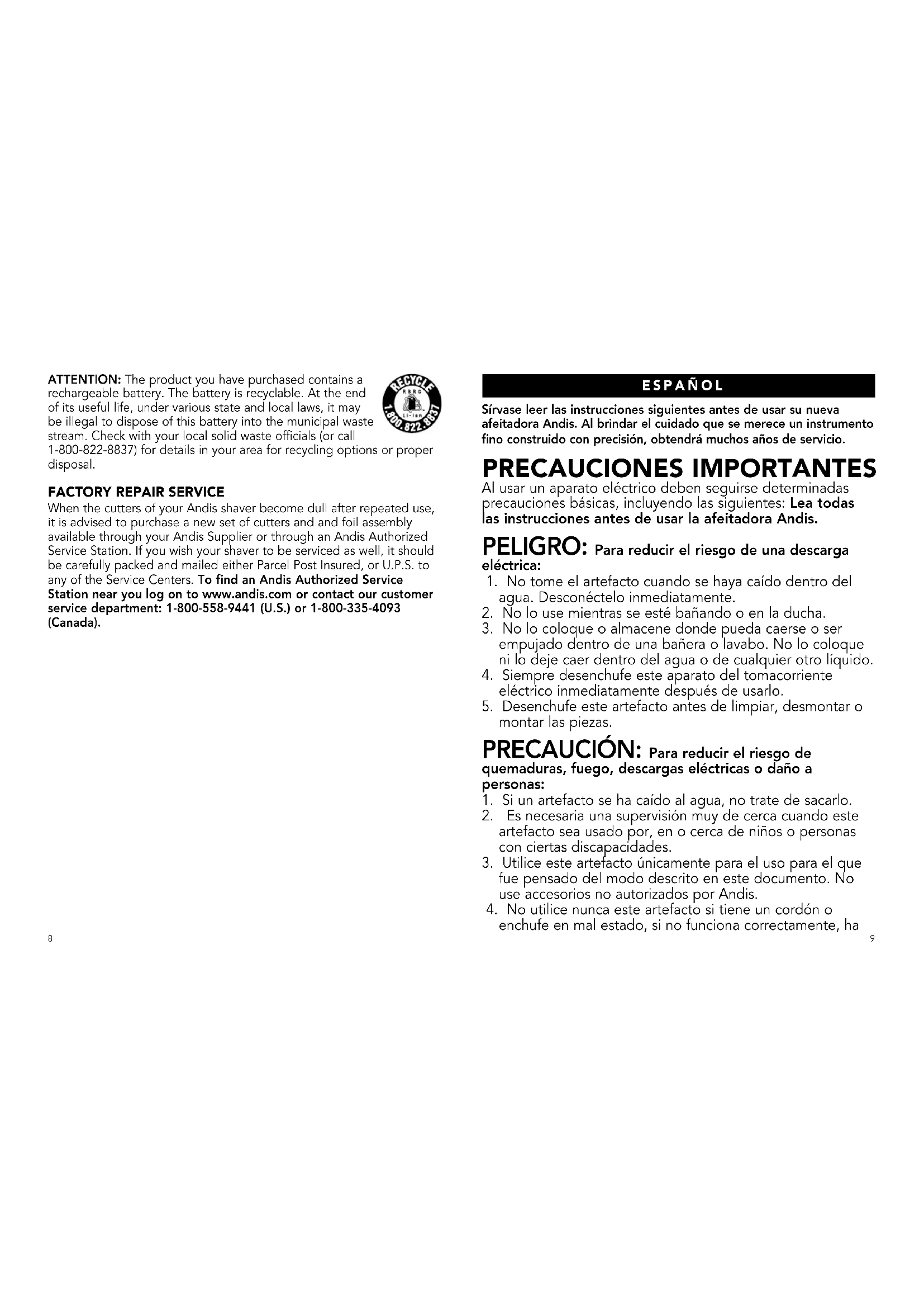 Al usar un aparato electrico deben seguirse determinadas precauciones BASicas, incluyendo las siguientes: Lea todas las instrucciones antes de usar la afeitadora Andis.