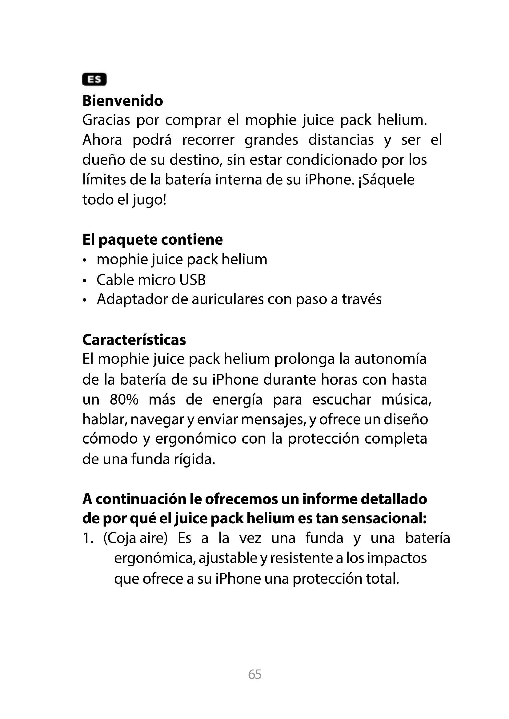 Gracias por comprar el mophie juice pack helium. Ahoraouldare recovergrandesdistanciasyser el dueño de su destino, sin estar condidcionado por los limitesde la bateria interna de su iPhone.Saquele todo el jugo!