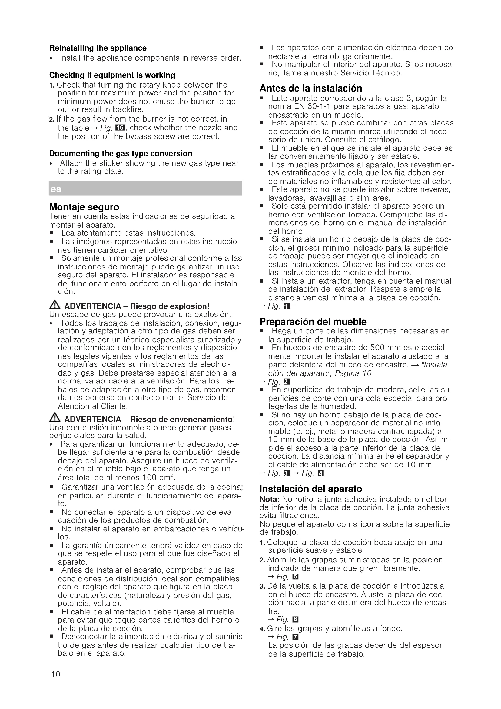 Montaje seguro Tener en cuenta estas indicaciones de seguridad al montar el aparato. ¡ Lea atentamente estas instrucciones. ¡ Las imágenes representadas en estas instruccio- nes tienen carácter orientativo. ¡ Solamente un montaje profesional conforme a las instrucciones de montaje puede garantizar un uso seguro del aparato. El instalador es responsable del funcionamiento perfecto en el lugar de instala- ción. ADVERTENCIA‒Riesgo de explosión! Un escape de gas puede provocar una explosión. ▶ Todos los trabajos de instalación, conexión, regu- lación y adaptación a otro tipo de gas deben ser realizados por un técnico especialista autorizado y de conformidad con los reglamentos y disposicio- nes legales vigentes y los reglamentos de las compañías locales suministradoras de electrici- dad y gas. Debe prestarse especial atención a la normativa aplicable a la ventilación. Para los tra- bajos de adaptación a otro tipo de gas, recomen- damos ponerse en contacto con el Servicio de Atención al Cliente. ADVERTENCIA‒Riesgo de envenenamiento! Una combustión incompleta puede generar gases perjudiciales para la salud. ▶ Para garantizar un funcionamiento adecuado, de- be llegar suficiente aire para la combustión desde debajo del aparato. Asegure un hueco de ventila- ción en el mueble bajo el aparato que tenga un área total de al menos 100cm