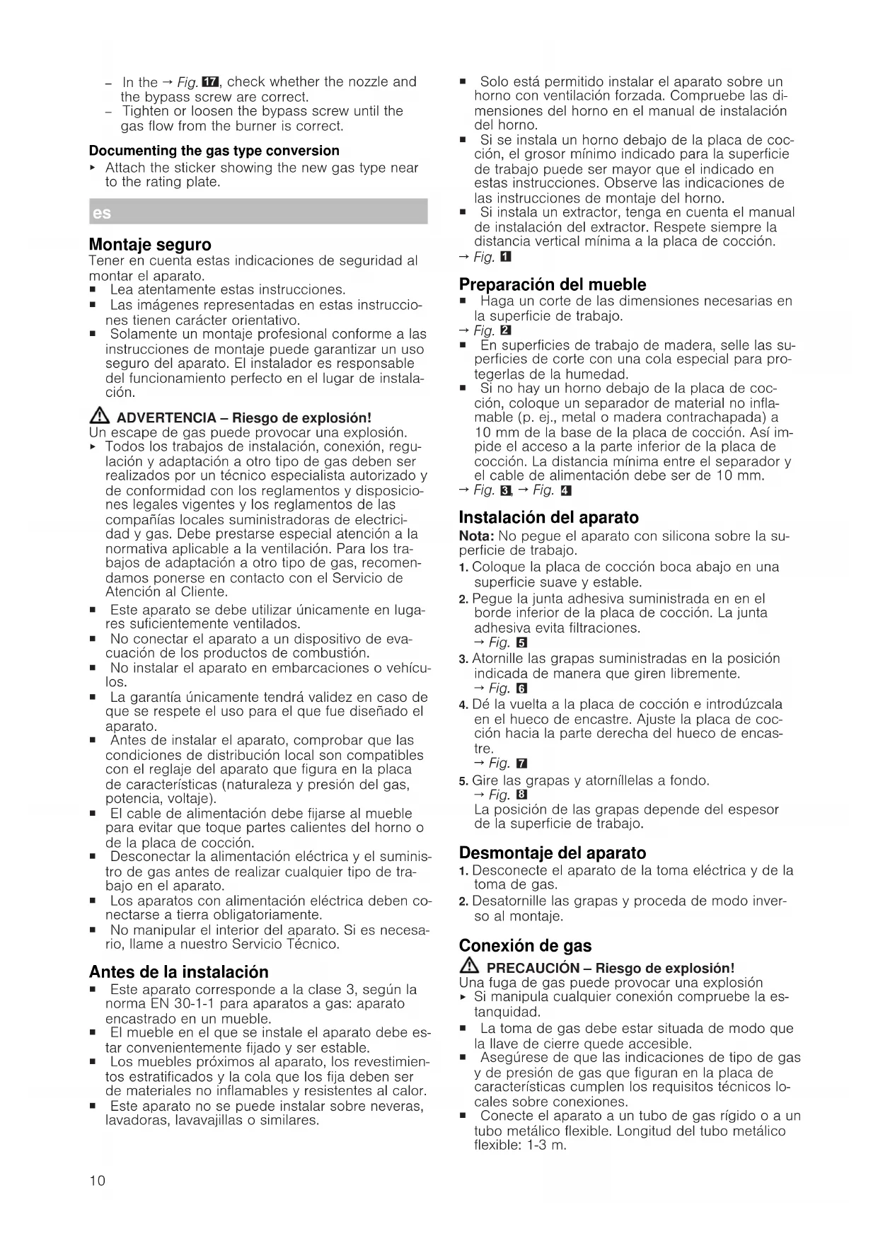 Montaje seguro Tener en cuenta estas indicaciones de seguridad al montar el aparato. ¡ Lea atentamente estas instrucciones. ¡ Las imágenes representadas en estas instruccio- nes tienen carácter orientativo. ¡ Solamente un montaje profesional conforme a las instrucciones de montaje puede garantizar un uso seguro del aparato. El instalador es responsable del funcionamiento perfecto en el lugar de instala- ción. ADVERTENCIA‒Riesgo de explosión! Un escape de gas puede provocar una explosión.
