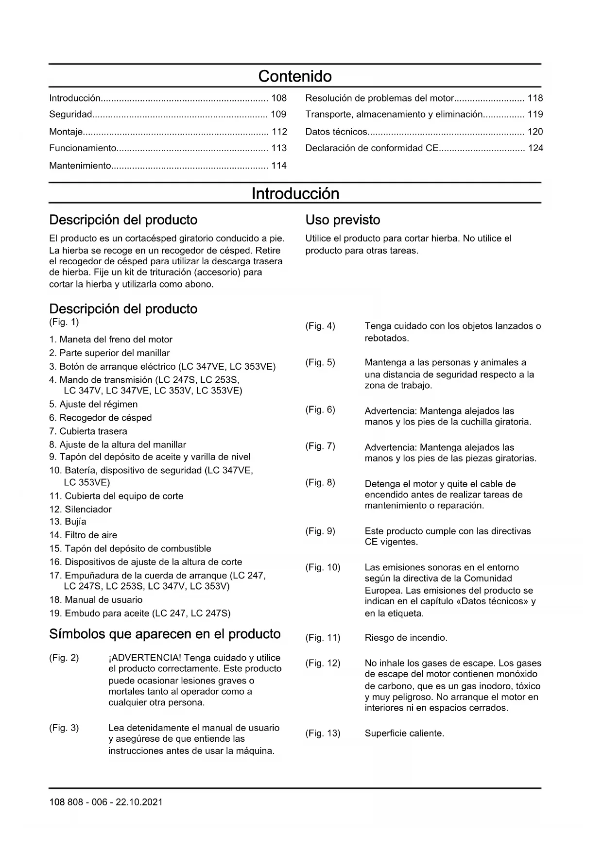 Símbolos que aparecen en el producto (Fig. 2) ¡ADVERTENCIA! Tenga cuidado y utilice el producto correctamente. Este producto puede ocasionar lesiones graves o mortales tanto al operador como a cualquier otra persona. (Fig. 3) Lea detenidamente el manual de usuario y asegúrese de que entiende las instrucciones antes de usar la máquina. (Fig. 4) Tenga cuidado con los objetos lanzados o rebotados. (Fig. 5) Mantenga a las personas y animales a una distancia de seguridad respecto a la zona de trabajo. (Fig. 6) Advertencia: Mantenga alejados las manos y los pies de la cuchilla giratoria. (Fig. 7) Advertencia: Mantenga alejados las manos y los pies de las piezas giratorias. (Fig. 8) Detenga el motor y quite el cable de encendido antes de realizar tareas de mantenimiento o reparación. (Fig. 9) Este producto cumple con las directivas CE vigentes. (Fig. 10) Las emisiones sonoras en el entorno según la directiva de la Comunidad Europea. Las emisiones del producto se indican en el capítulo «Datos técnicos» y en la etiqueta. (Fig. 11) Riesgo de incendio. (Fig. 12) No inhale los gases de escape. Los gases de escape del motor contienen monóxido de carbono, que es un gas inodoro, tóxico y muy peligroso. No arranque el motor en interiores ni en espacios cerrados. (Fig. 13) Superficie caliente. 108 808 - 006 - 22.10.2021(Fig. 15) Llene el motor de aceite antes de arrancar el producto. (Fig. 16) Procedimiento de arranque para el modelo LC 247, LC 247S, LC 253S, LC 347V, LC 353V: Presione la maneta del freno del motor y tire de la empuñadura de la cuerda de arranque. (Fig. 17) Procedimiento de arranque para el modelo LC 347VE, LC 353VE: Presione la mane- ta del freno del motor y pulse el botón de arranque. (Fig. 14) Código escaneable. Nota: Los demás símbolos/etiquetas que aparecen en el producto corresponden a requisitos de homologación específicos en otras zonas comerciales. Emisiones Euro V ADVERTENCIA: La manipulación del motor anula la homologación de la UE de este producto. Responsabilidad sobre el producto Como se estipula en las leyes de responsabilidad del producto, no nos hacemos responsables de los daños y perjuicios causados por nuestro producto si:
