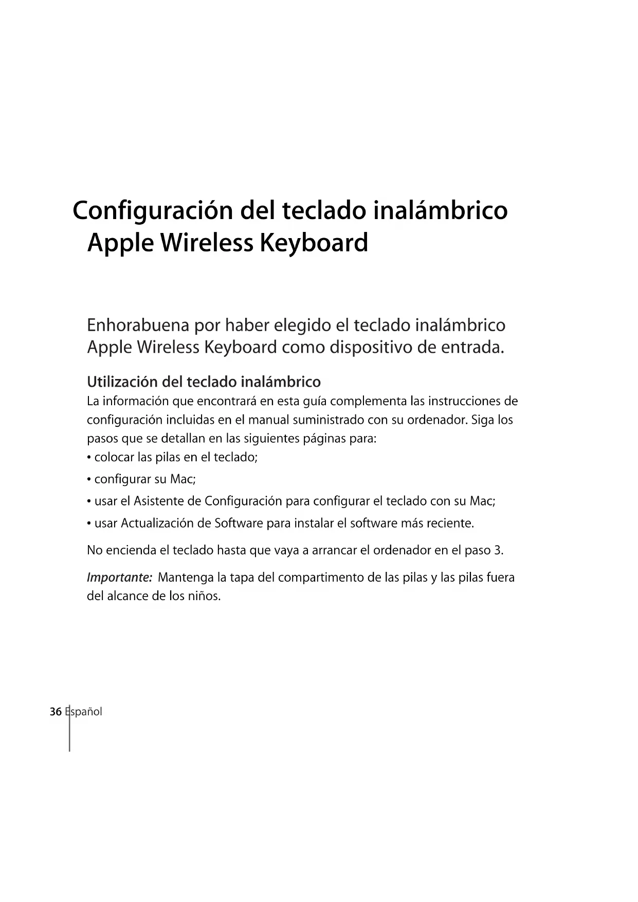 Per espellere un disco, premi e mantieni premuto il tasto Espelli. 1E4319.book Page 33 Tuesday, August 7, 2007 2:58 PM34 Italiano Personalizzare la tastiera Puoi personalizzare la tastiera utilizzando il pannello Tastiera delle preferenze Tastiera e mouse. Per personalizzare la tastiera: 1 Scegli Apple () > Preferenze di sistema. 2 Fai clic su Tastiera e mouse. 3 Fai clic su Tastiera o su Abbreviazioni da tastiera. Fai clic su Abbreviazioni da tastiera per assegnare abbreviazioni di tastiera ai comandi dei menu in un'applicazione Mac OS X o nel Finder. Puoi reperire ulteriori informazioni sulla tastiera in Aiuto Mac. Apri Aiuto Mac e cerca “tastiera”. Rinominare la tastiera Il tuo Mac assegna automaticamente alla tastiera un nome esclusivo la prima volta che vengono abbinati. Puoi rinominarli utilizzando le preferenze Tastiera e Mouse. Scegli Apple () > Preferenze di Sistema e fai clic su Tastiera e Mouse. Fai clic sulla linguetta Bluetooth® e inserisci un nome nel campo Nome. Pulire la tastiera Per pulire l'esterno della tastiera, segui queste linee guida: Â Rimuovi le batterie dalla tastiera. Â Per pulire l'esterno della tastiera, utilizza un panno morbido, umido, non sfilacciato, prestando attenzione a non fare entrare liquido nelle fessure. Â Non utilizzare spray, solventi o prodotti abrasivi. 1E4319.book Page 34 Tuesday, August 7, 2007 2:58 PMItaliano 35 Informazioni sulle batterie La tastiera Apple Wireless Keyboard è fornita con tre batterie alcaline. Puoi alimentarla con batterie alcaline, al litio o ricaricabili AA. Per verificare il livello di carica della batteria, puoi utilizzare le preferenze Tastiera e Mouse. Scegli Apple () > Preferenze di Sistema. Fai clic su Tastiera e Mouse, quindi su Bluetooth. Nota: per risparmiare l'energia delle batterie, spegni la tastiera quando non la utilizzi. Se pensi di non utilizzare la tastiera per un periodo lungo, rimuovi le batterie. Per lo smaltimento delle batterie, attieniti alle linee guida e alla normativa ambientale locale. Ergonomia Per informazioni su ergonomia, salute e sicurezza, visita il sito web di Apple www.apple.com/it/about/ergonomics. Supporto Per informazioni di supporto e risoluzione dei problemi, forum e download degli ultimi software Apple, consulta il sito www.apple.com/it/support. ATTENZIONE: quando sostituisci le batterie, cambiale tutte in una volta sola. Non mischiare le batterie vecchie con quelle nuove e non mischiare batterie di diverso tipo (ad esempio, non utilizzare insieme batterie alcaline e al litio). Non aprirle o forarle, installarle al contrario, o esporle a fuoco, alte temperature o acqua. Tienile lontane dalla portata dei bambini. 1E4319.book Page 35 Tuesday, August 7, 2007 2:58 PM36 Español 6 Configuración del teclado inalámbrico Apple Wireless Keyboard Enhorabuena por haber elegido el teclado inalámbrico Apple Wireless Keyboard como dispositivo de entrada. Utilización del teclado inalámbrico La información que encontrará en esta guía complementa las instrucciones de configuración incluidas en el manual suministrado con su ordenador. Siga los pasos que se detallan en las siguientes páginas para: Â colocar las pilas en el teclado; Â configurar su Mac; Â usar el Asistente de Configuración para configurar el teclado con su Mac; Â usar Actualización de Software para instalar el software más reciente. No encienda el teclado hasta que vaya a arrancar el ordenador en el paso 3. Importante: Mantenga la tapa del compartimento de las pilas y las pilas fuera del alcance de los niños. 1E4319.book Page 36 Tuesday, August 7, 2007 2:58 PMEspañol 37 Paso 1: Colocación de las pilas Siga las instrucciones que figuran a continuación para insertar las pilas en el teclado inalámbrico Apple Wireless Keyboard. Para colocar las pilas en el teclado: 1 Con la ayuda de una moneda, extraiga la tapa del compartimento de las pilas. 2 Introduzca las pilas en el compartimento tal como se muestra en la imagen. 3 Coloque la tapa en el compartimento de las pilas y deje el teclado apagado hasta que vaya a arrancar el ordenador en el paso 3. Nota: Cuando el indicador luminoso de encendido está apagado, el teclado está apagado. Tapa del compartimento de las pilas Introduzca las pilas 1E4319.book Page 37 Tuesday, August 7, 2007 2:58 PM38 Español Paso 2: Configuración de su Mac Para configurar su ordenador, siga las instrucciones que figuran en el manual de usuario que venía con su Mac. Puesto que dispone de un teclado inalámbrico, no es necesario que lea las instrucciones correspondientes a la conexión de un teclado USB. No arranque el Mac hasta que se le solicite hacerlo en el paso 3. Paso 3: Configuración del enlace con el teclado Antes de poder utilizar el teclado, debe enlazarlo con su Mac. El proceso de enlace permite que el teclado se comunique de forma inalámbrica con el ordenador. Esta operación solo deberá llevarse a cabo una vez. La primera vez que arranca el ordenador, el Asistente de Configuración le guía a través de los pasos necesarios para configurar el teclado inalámbrico Apple Wireless Keyboard y enlazarlo con su Mac. 1 Para encender el teclado inalámbrico Apple Wireless Keyboard, pulse el botón de encendido/apagado (®). 2 Encienda el ordenador. 3 Cuando el sistema haya arrancado, siga las instrucciones del Asistente de Configuración que van apareciendo en pantalla. Botón de encendido/ apagado Indicador luminoso de encendido 1E4319.book Page 38 Tuesday, August 7, 2007 2:58 PMEspañol 39 Paso 4: Instalación del software Para utilizar su teclado y sacar el máximo partido a todas sus prestaciones, deberá actualizar su sistema a la versión 10.4.10 o posterior del Mac OS X e instalar la actualización de software del teclado. Para actualizar su sistema a la última versión disponible de Mac OS X e instalar la actualización de software del teclado, seleccione Apple () > “Actualización de Software” en la barra de menús y siga las instrucciones que aparecen en pant
