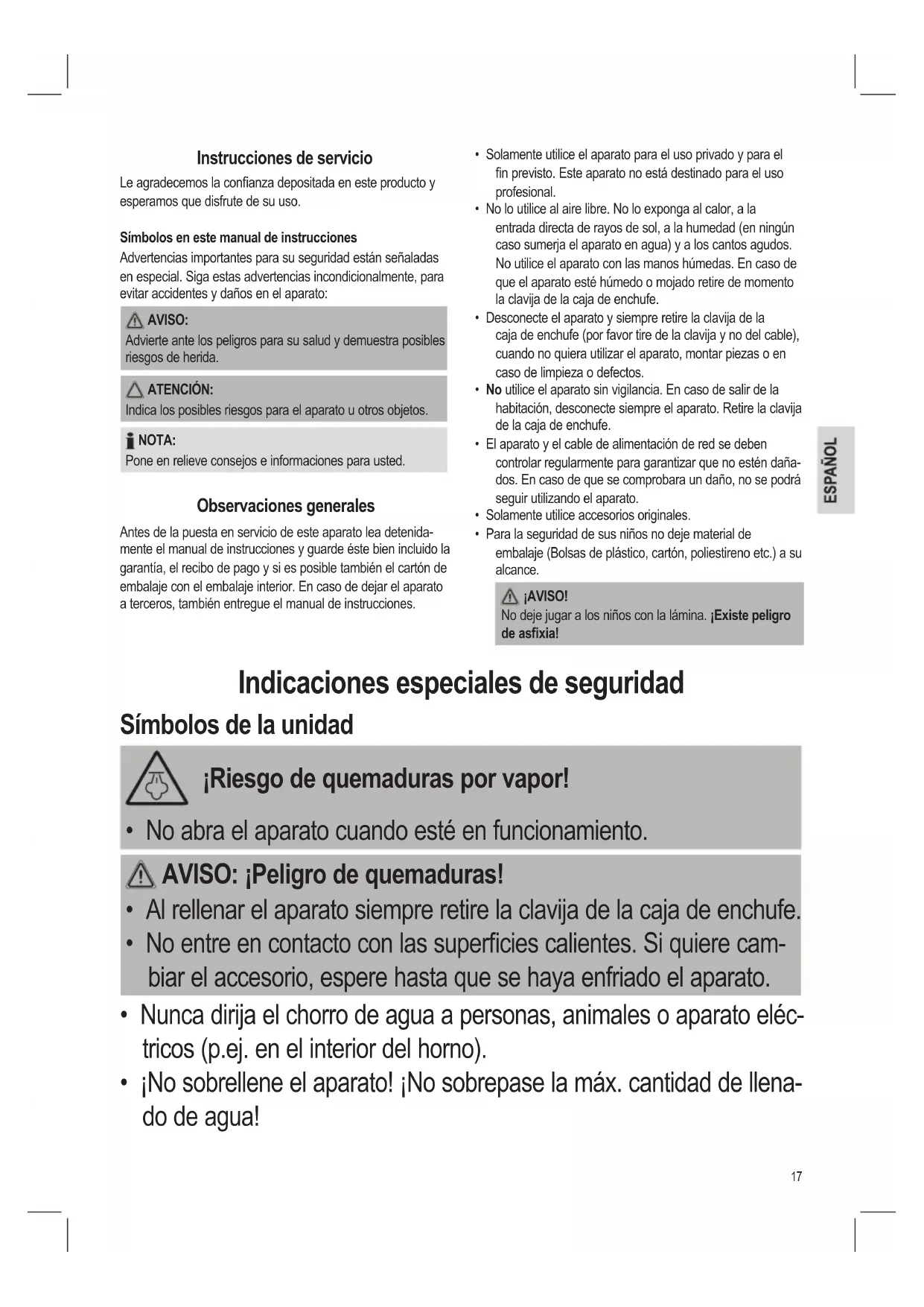 - Este aparato no está diseñado para sumergirlo en agua durante su limpieza. Siga las instrucciones que hemos incluido en el capítulo “Limpieza”.19 AVISO: Riesgo de lesiones!