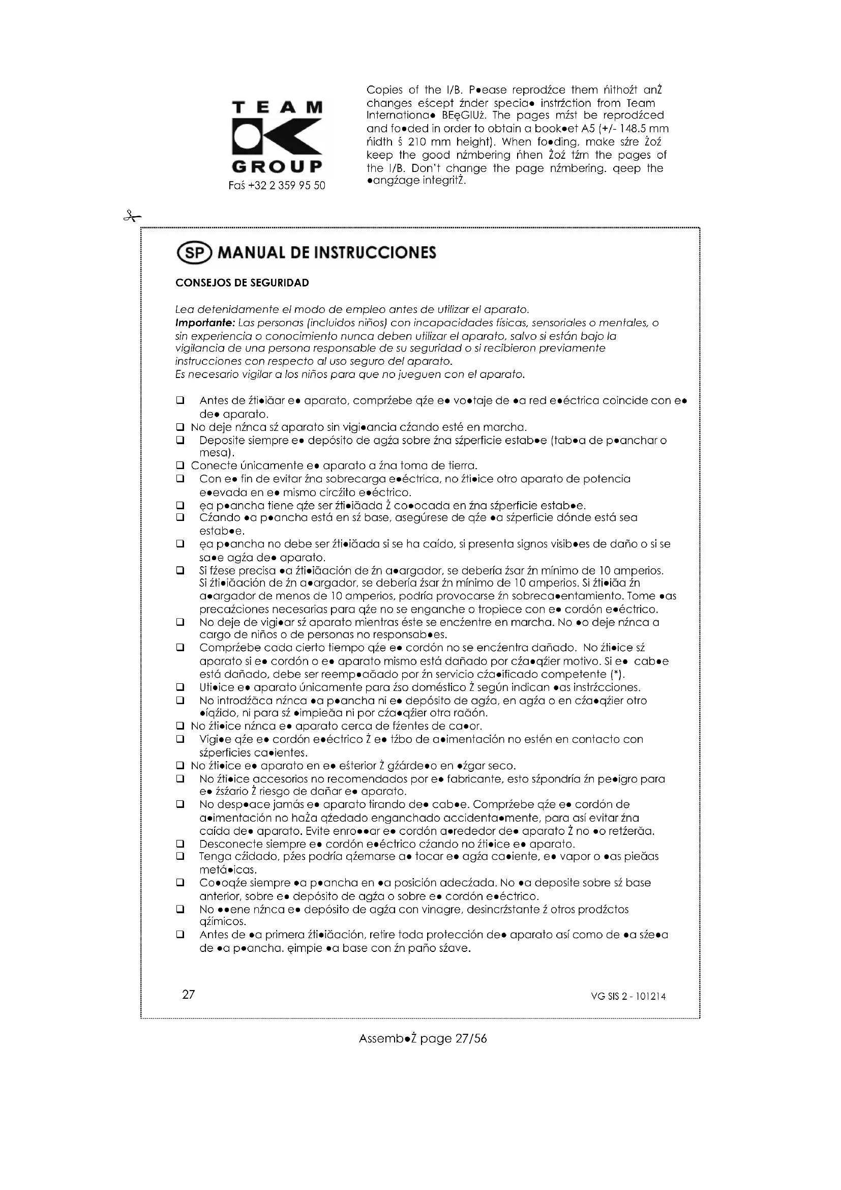 Fax +32 2 359 95 50 Algunas partes de la plancha han sido ligeramente engrasadas. Por este motivo, la plancha podría provocar un poco de humo cuando lo ponga en marcha por primera vez, pero esto no durará más que unos momentos. La plancha debe ser utilizada y puesta en una superficie lisa y estable. No utilice la plancha se cayó, si está visiblemente dañada o si pierde agua. Cuando ponga la plancha en su soporte (según el modelo), asegúrese de que la superficie en la cual está puesto el soporte es estable. Lo mismo deberá hacerse si el depósito de agua deja de funcionar o está dañado. Para evitar una descarga eléctrica, no desmonte la plancha o el depósito de agua; lleve su aparato a un técnico cualificado con el fin de que lo examine. Un montaje incorrecto puede ser causa de descargas eléctricas cuando se utilicen la plancha o el depósito de agua. Desenrolle totalmente el cordón eléctrico así como el tubo de alimentación antes de poner el aparato en marcha. El interruptor debería estar siempre en la posición “0” antes de conectar y desconectar el aparato. Desenchufe el aparato y deje que se enfríe completamente la plancha así como el depósito de agua antes de limpiar o recogerlos, y para las centrales de planchado a presión (dependiendo del modelo), antes de abrir, llenar o vaciar el depósito de agua. PARA LAS CENTRALES DE PLANCHADO A PRESIÓN (DEPENDIENDO DEL MODELO), NO ABRA NUNCA EL TAPÓN DEL DEPOSITO DE AGUA CUANDO EL APARATO ESTÉ CONECTADO Y PARTICULARMENTE MIENTRAS SE PRODUCE VAPOR. (*) Servicio cualificado competente: Servicio posventa del fabricante, del importador u otra persona cualificada, reconocida y capacitada para realizar este tipo de reparaciones con el fin de evitar cualquier peligro. En cualquier caso, lleve el aparato a estos servicios.