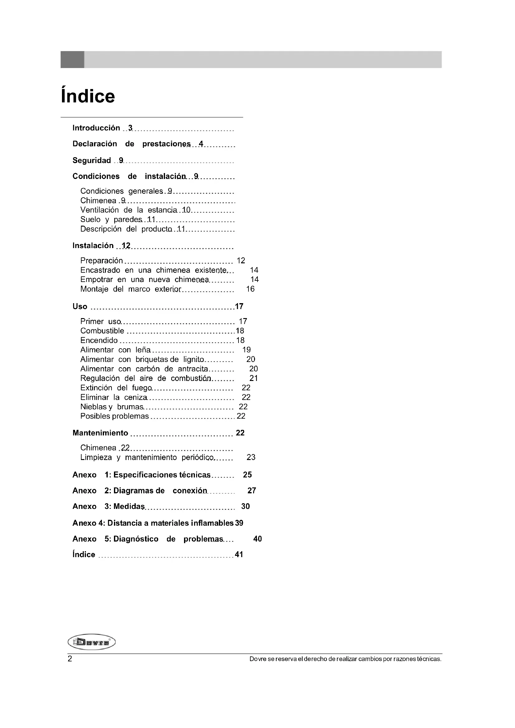 En este manual podra leer como instalar, utilizar ymantener su aparato de calefaction DOVRE de manera segura. Si desea Obtener mas informacion o datos技术和aderencias, o si Tiene problemas con la instalacion,pongase en contacto con su distribuidor.