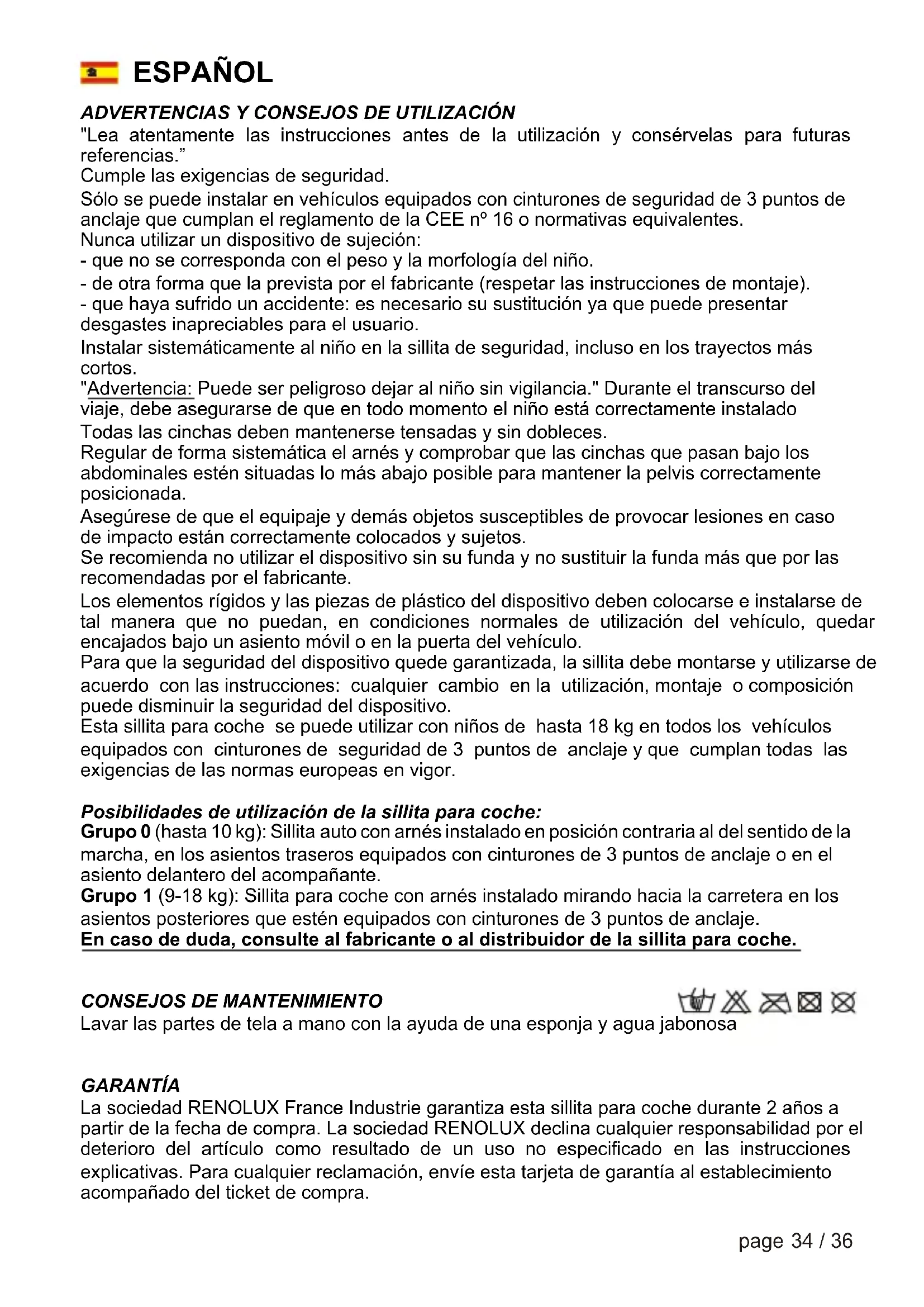 Lavar las partes de tela a mano con la ayuda de una esponja y agua jabonosa GARANTÍA La sociedad RENOLUX France Industrie garantiza esta sillita para coche durante 2 años a partir de la fecha de compra. La sociedad RENOLUX declina cualquier responsabilidad por el deterioro del artículo como resultado de un uso no especificado en las instrucciones explicativas. Para cualquier reclamación, envíe esta tarjeta de garantía al establecimiento acompañado del ticket de compra. ESPAÑOL35 / 36 page En caso de deterioro de una funda, puede conseguir una nueva bajo pedido. Para cualquier otro componente que requiera su desmontaje, está prohibido que el usuario realice él mismo una reparación o un cambio. En particular, una sillita que ha sufrido un accidente no debe volver a utilizarse. De la misma manera, se desaconseja utilizar una sillita adquirida de segunda mano de la que no se conozca el trato que le ha dispensado el comprador anterior. Certificado de garantia La presente garantía es válida dentro del territorio nacional (España).Producto garantizado por 2 años a partir de la fecha de compra, siempre que su uso sea aquel para el cual se ha destinado, y que en su utilización se hayan seguido las instrucciones de manipulación del mismo. El cliente deberá notificar el defecto en un plazo máximo de dos meses a partir del conocimiento del mismo, siempre dentro del periodo de validez de la garantía. La acción para reclamar el cumplimiento de lo dispuesto en la garantía prescribirá a los seis meses desde la finalización del plazo de la misma. Las vías de reclamación del consumidor: - Arbitraje de derecho a través del Instituto Nacional de Consumo y los Órganos o entidades correspondientes de las comunidades autónomas y de las corporaciones locales competentes. - Jurisdicción Ordinaria Quedan excluidos de garantía todos aquellos defectos producidos por golpes, roturas, manchas, caídas, aplastamiento, acción de fuego, utilización indebida de elementos de limpieza que deterioren su aspecto, etc. Para determinar el punto anterior, el producto deberá ser analizado por la fábrica, en el caso de que el deterioro haya sido causado por el uso indebido del usuario, éste deberá decidir si desea que sea reparado (abonando los gastos) y especificar el medio de transporte por el que desea que le sea devuelto tras su reparación (asumiendo los gastos de envío). En el caso de que el defecto sea de fabricación, el fabricante repondrá la pieza defectuosa al distribuidor, sin cargo de portes, después de recibir este certificado de garantía debidamente firmado y sellado en el punto de venta.